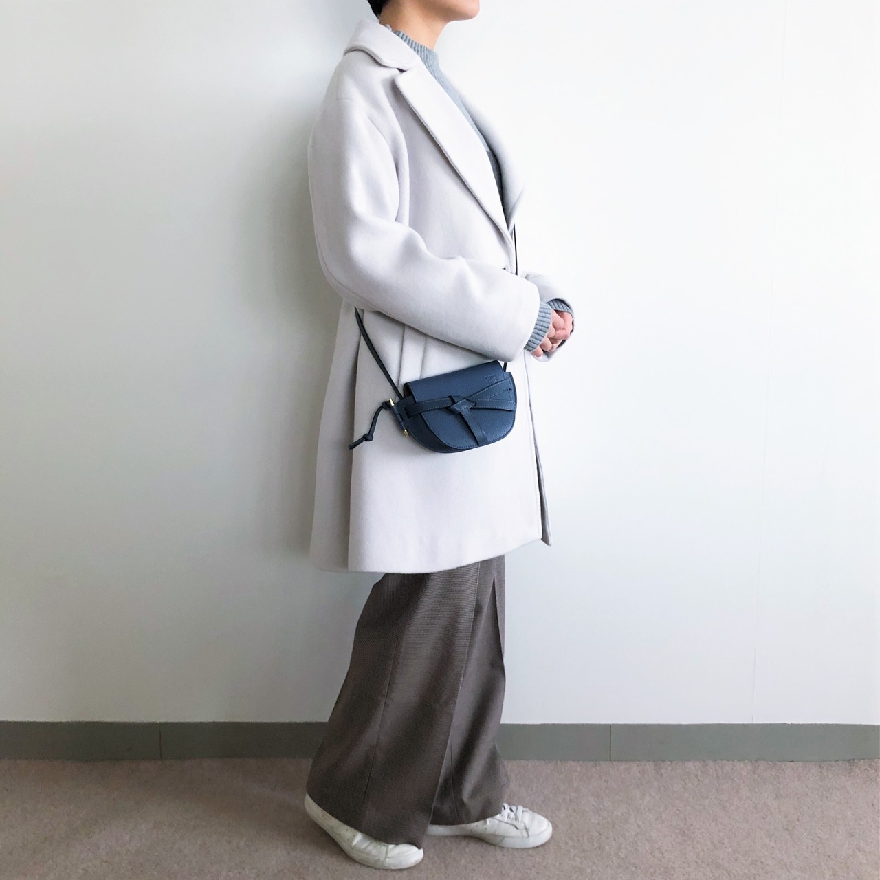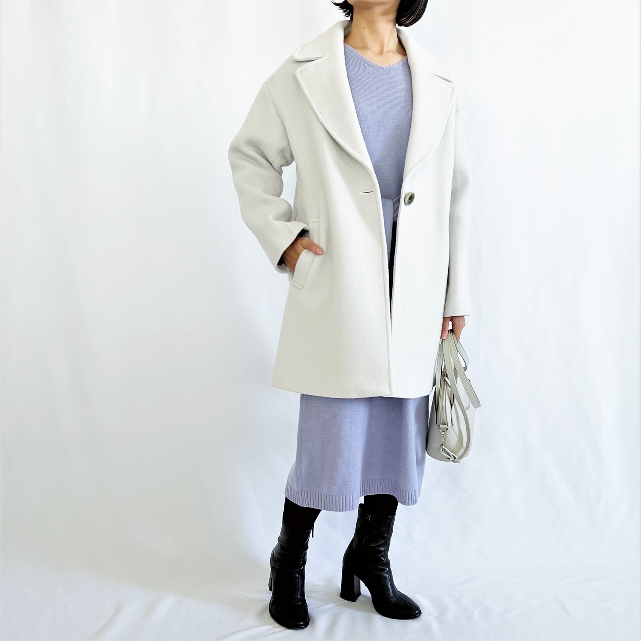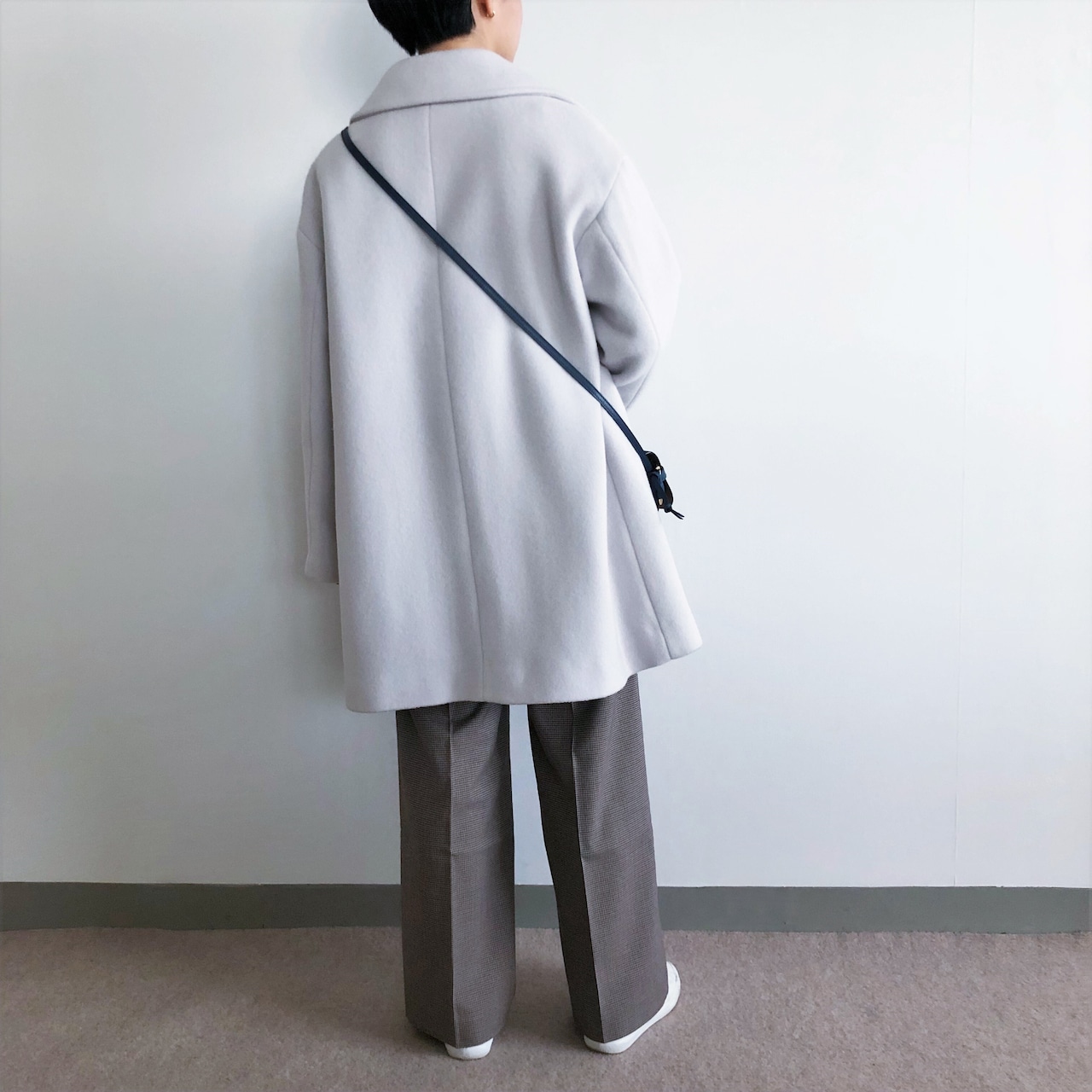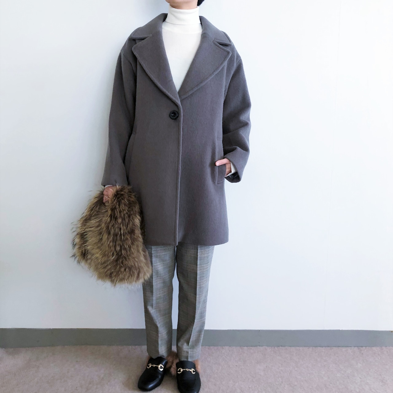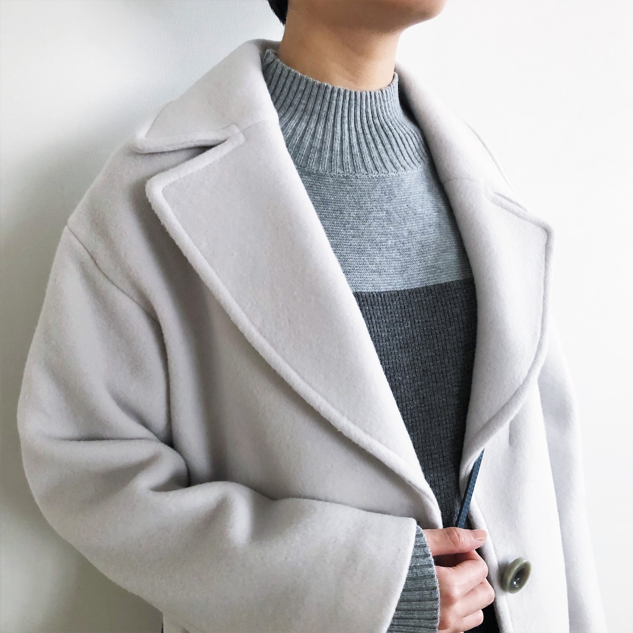 ビッグサイズのテーラードコート。オーバーシルエットと肉厚な生地感で、ぽてっとした雰囲気が可愛いです。しっかりとした生地なのでAラインのシルエット綺麗に出ますよ。ちょうどおしりが隠れる丈感で、寒い冬も乗り越えられる暖かいコートです。