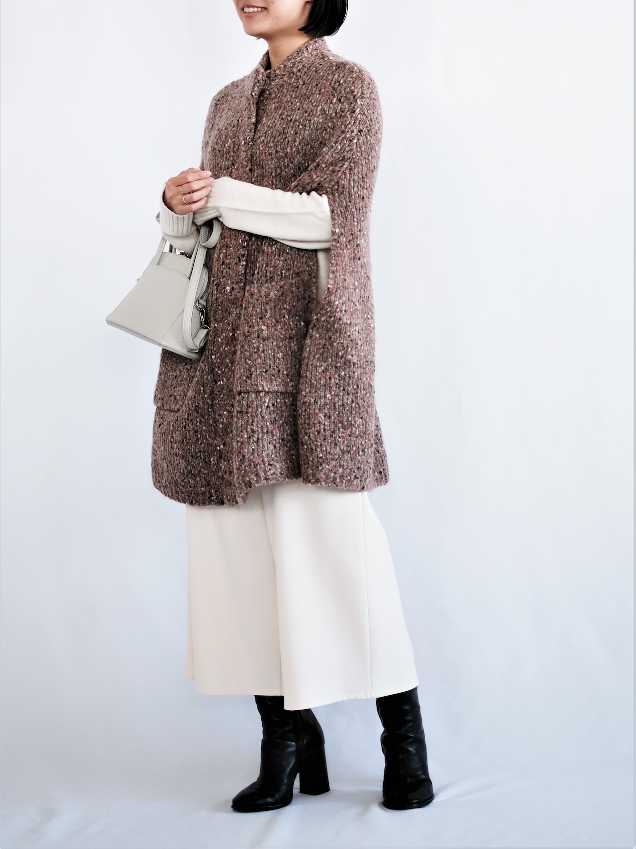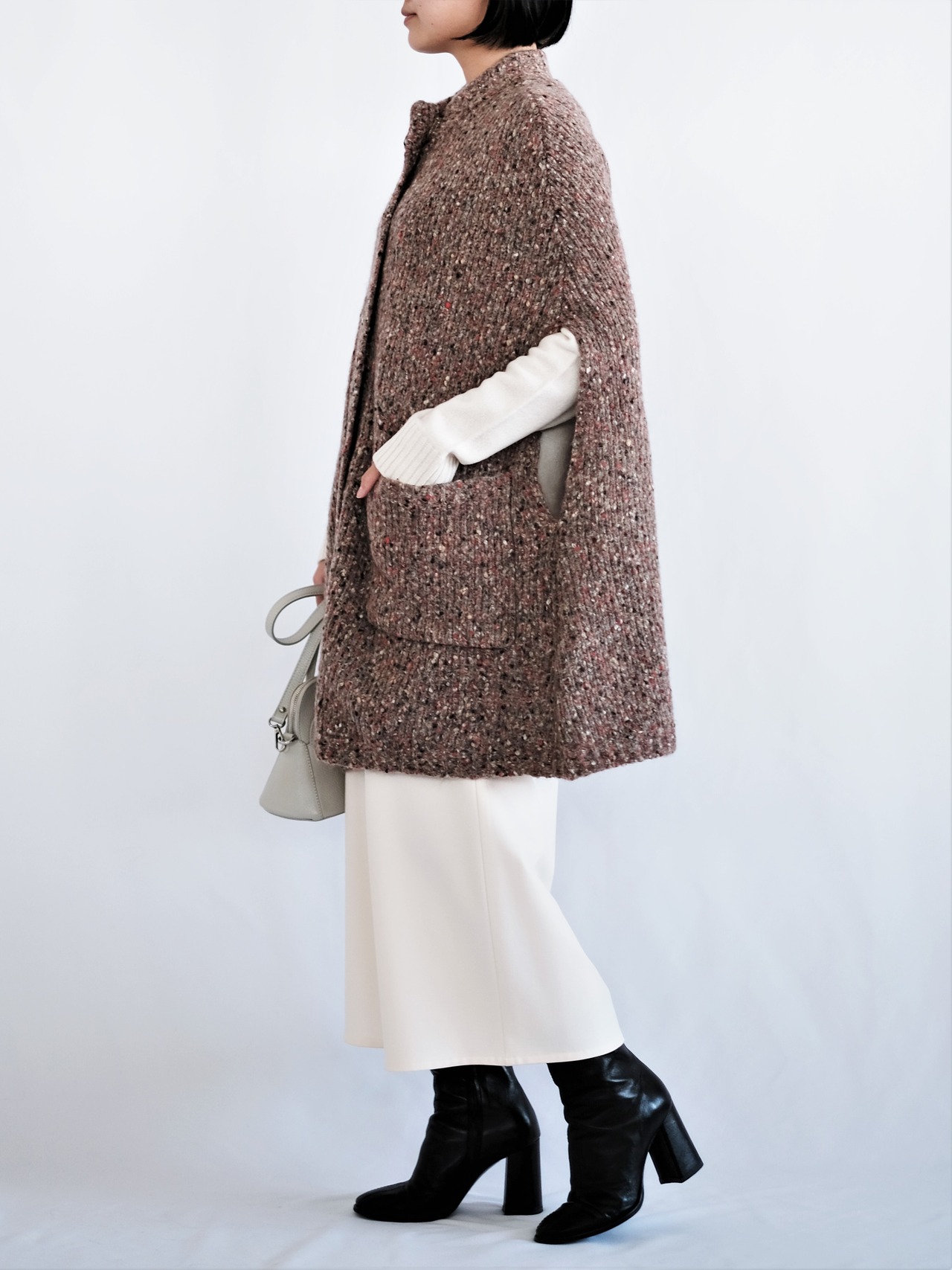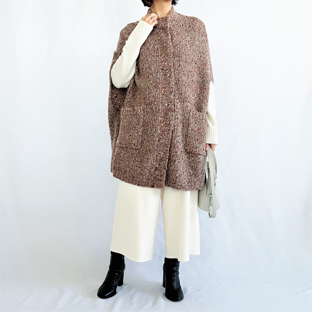 暖色で纏められたネップ生地がポイントのポンチョベスト。肉厚の生地で、暖かく着ていただけます。さらりと羽織るだけで雰囲気のでる嬉しいアイテムです。