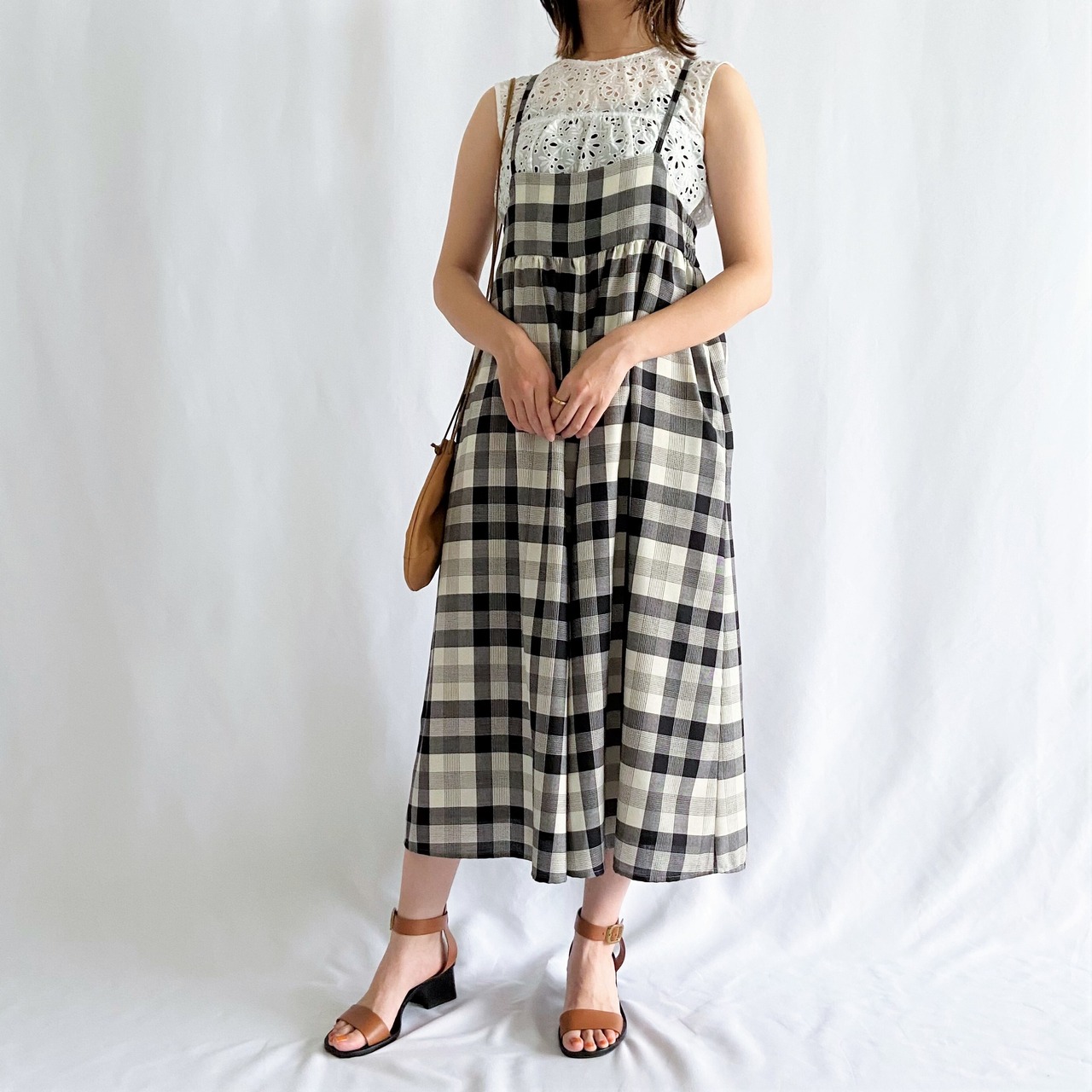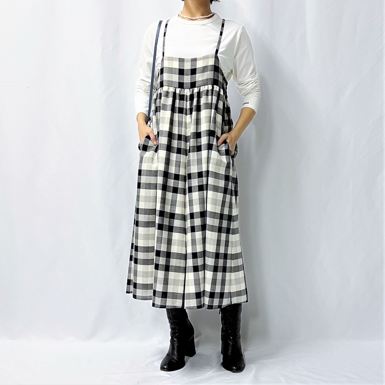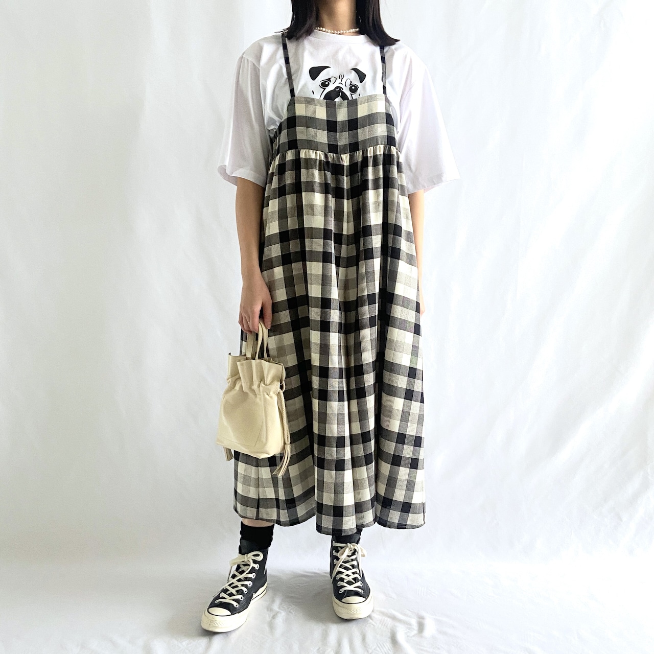 大きめのざっくりとしたチェック柄が目を惹くサロペット。