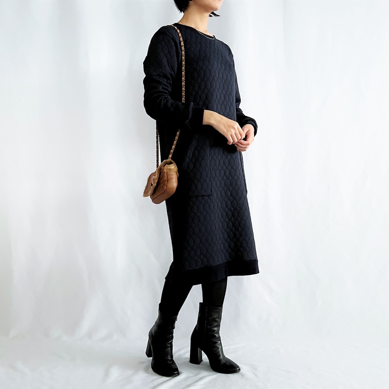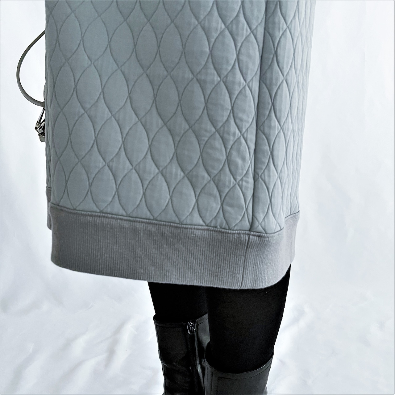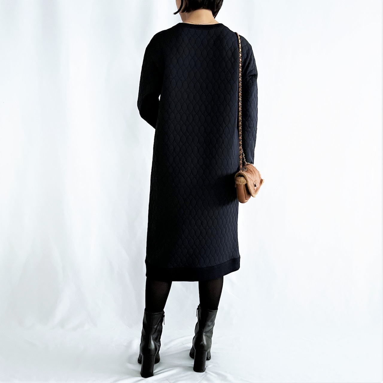 ほどよい厚みが着やすいキルティングのワンピース。ストレッチの効いた生地感で、ストレスフリーな着心地です。柔らかい印象のブルーグレーと、きっちり感もあるネイビーの2色展開。