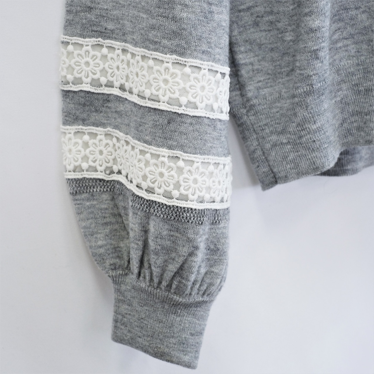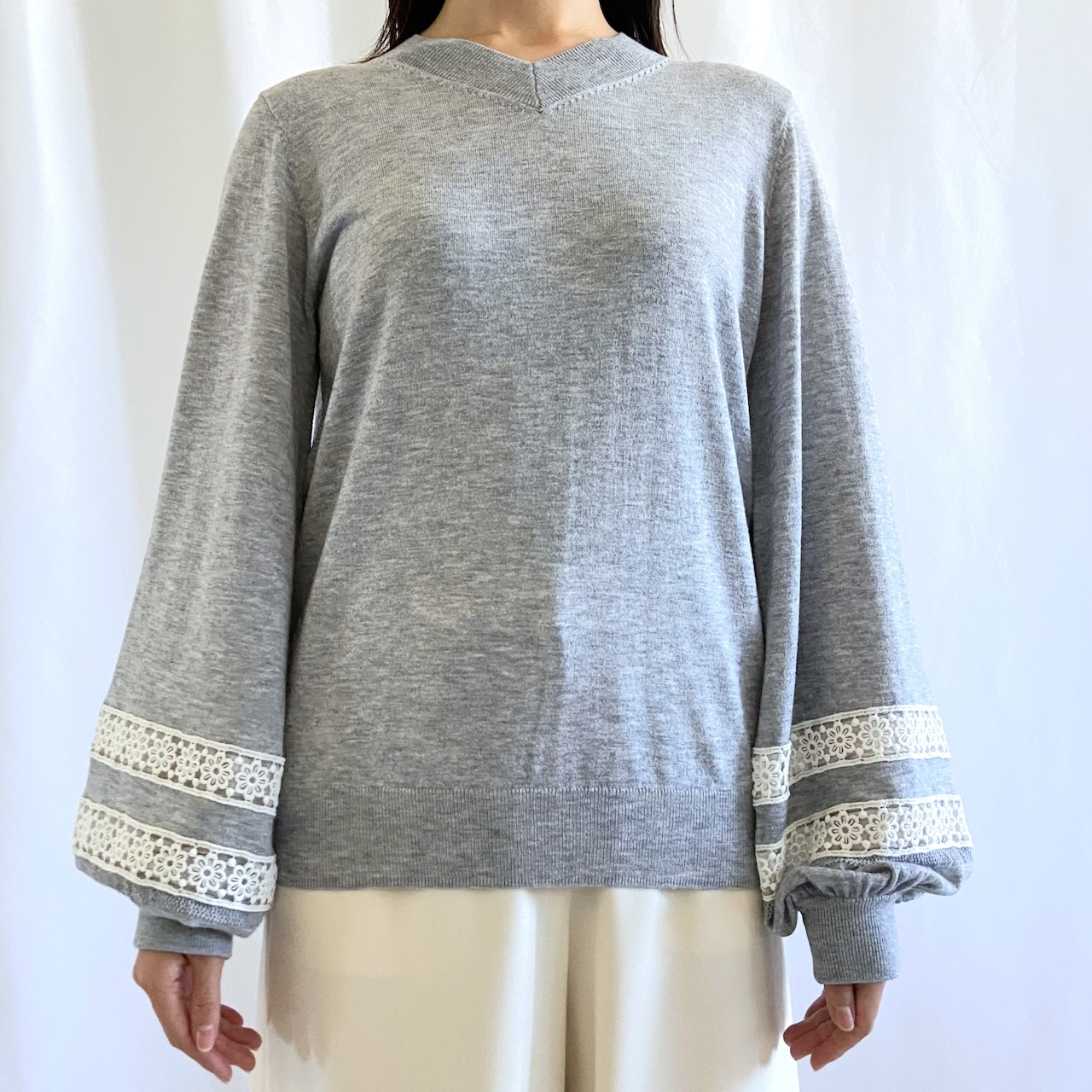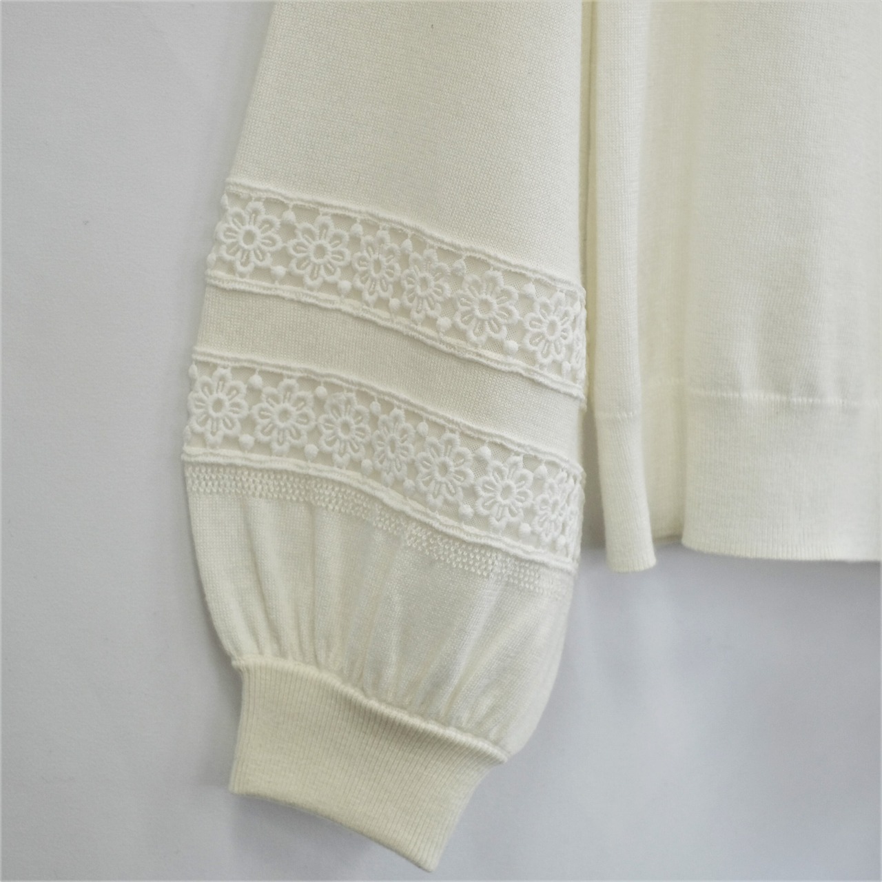やわらかい肌触りのニットカットソー。袖にあしらったレースがポイントになっています。袖口にかけてのぽってりとしたシルエットがポイント。クルーネックタイプ・ハイネックタイプの形違いもあります。