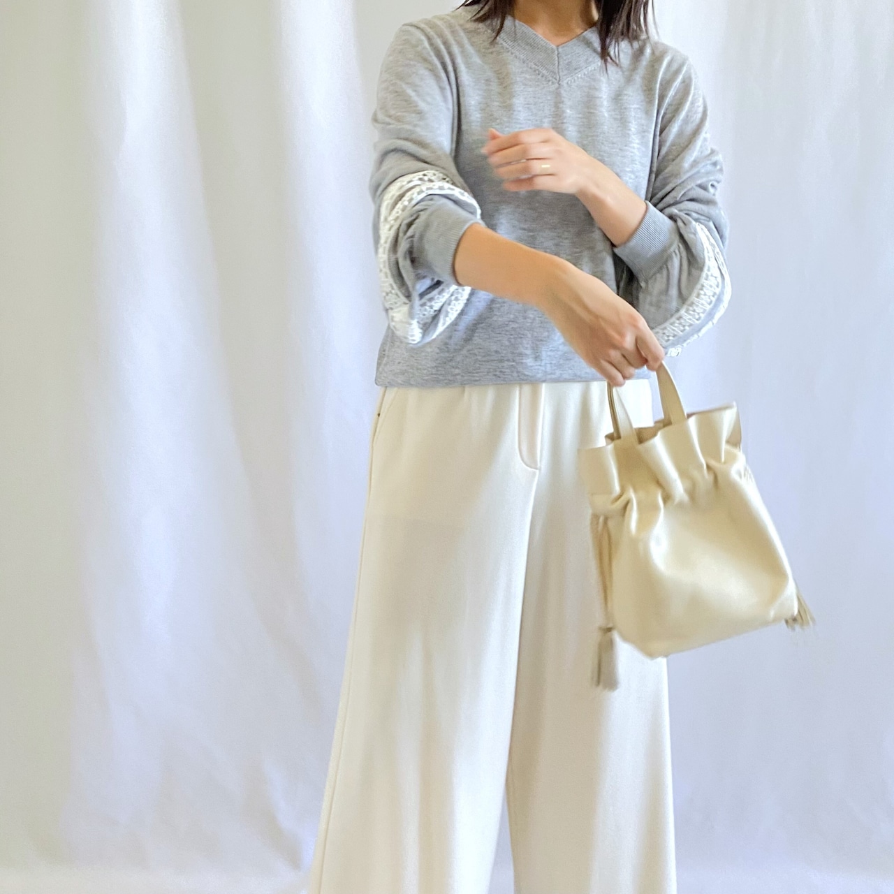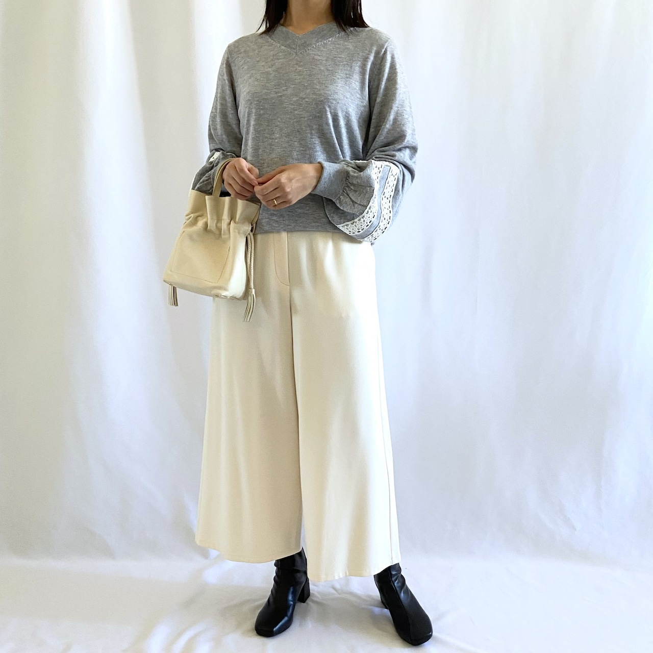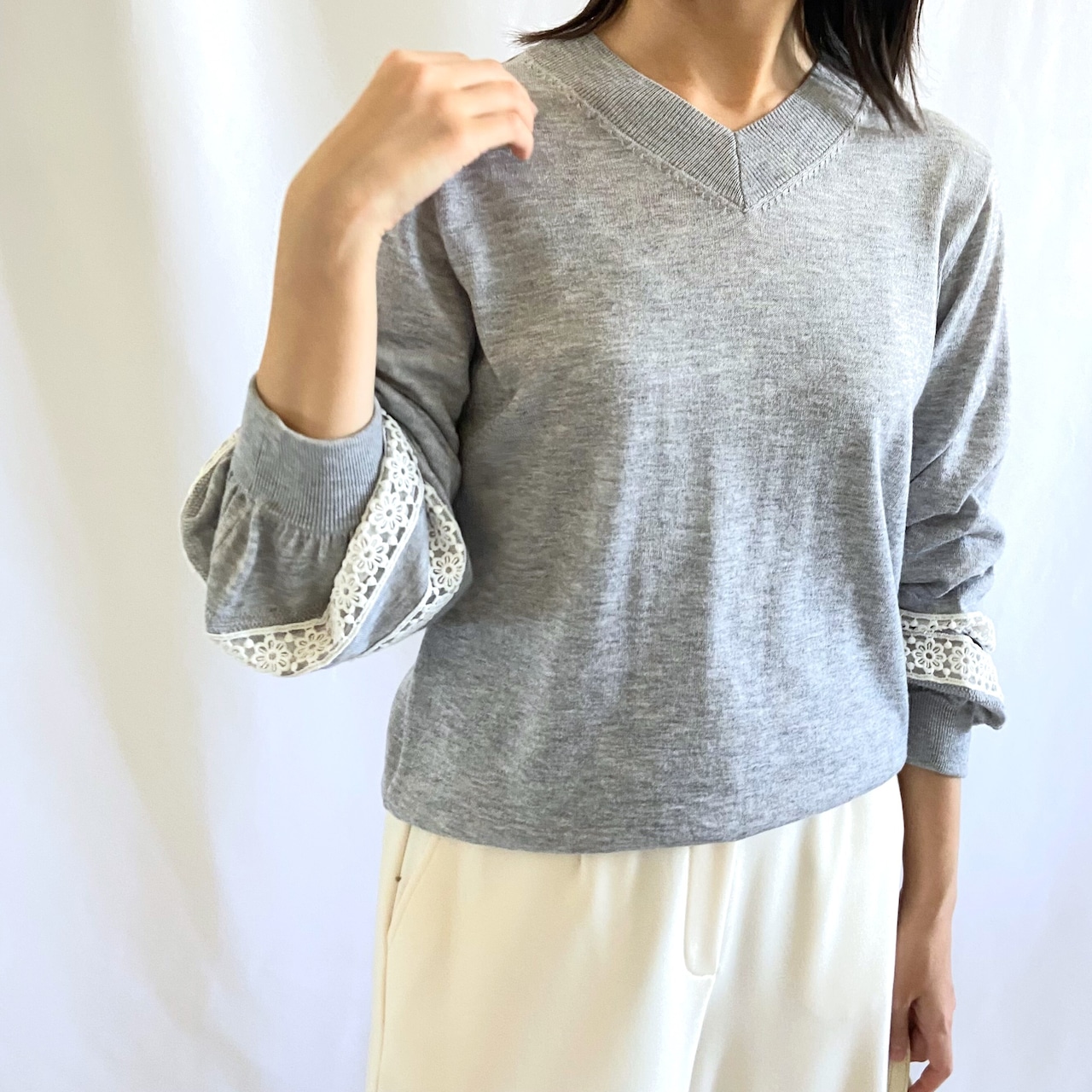 やわらかい肌触りのニットカットソー。袖にあしらったレースがポイントになっています。袖口にかけてのぽってりとしたシルエットがポイント。クルーネックタイプ・ハイネックタイプの形違いもあります。