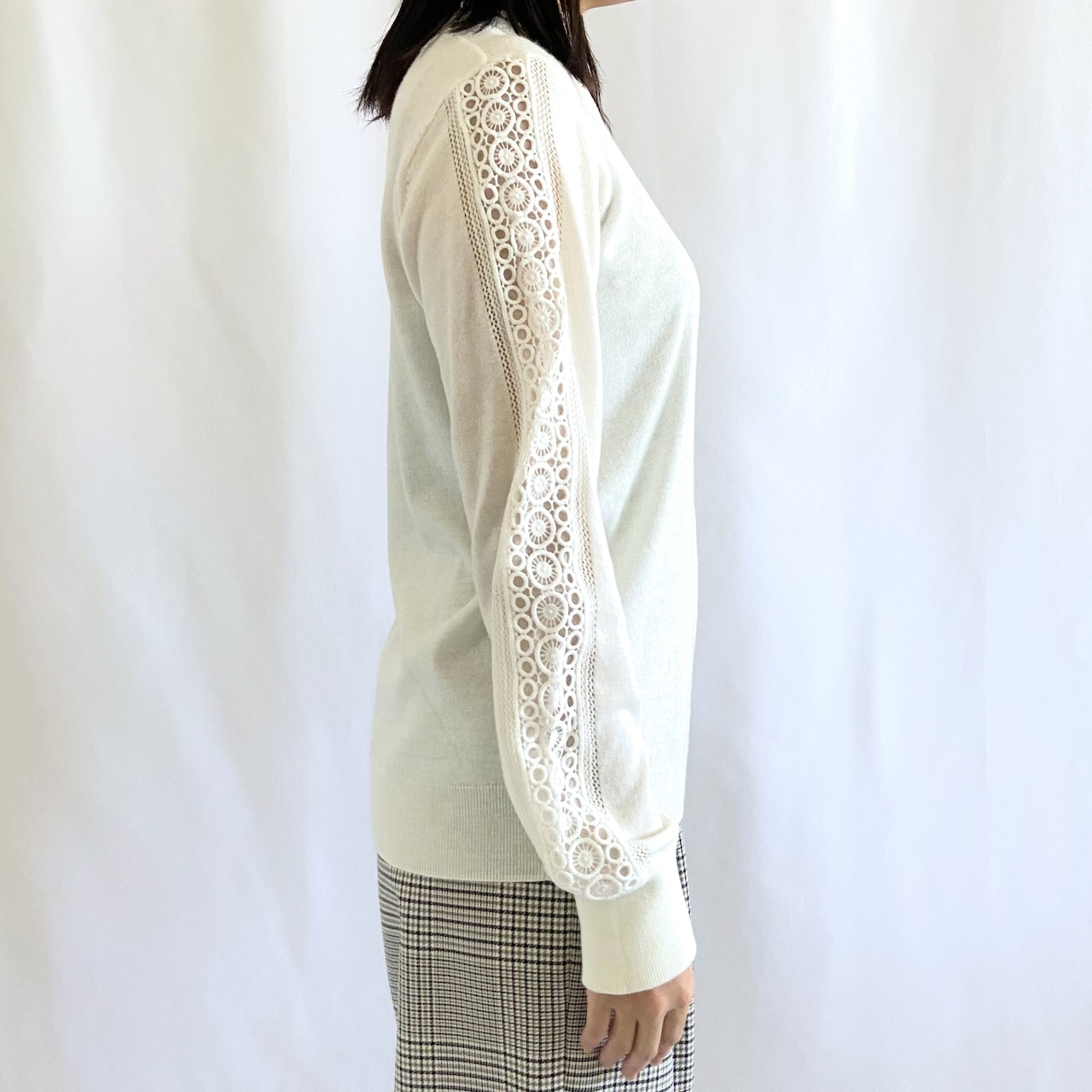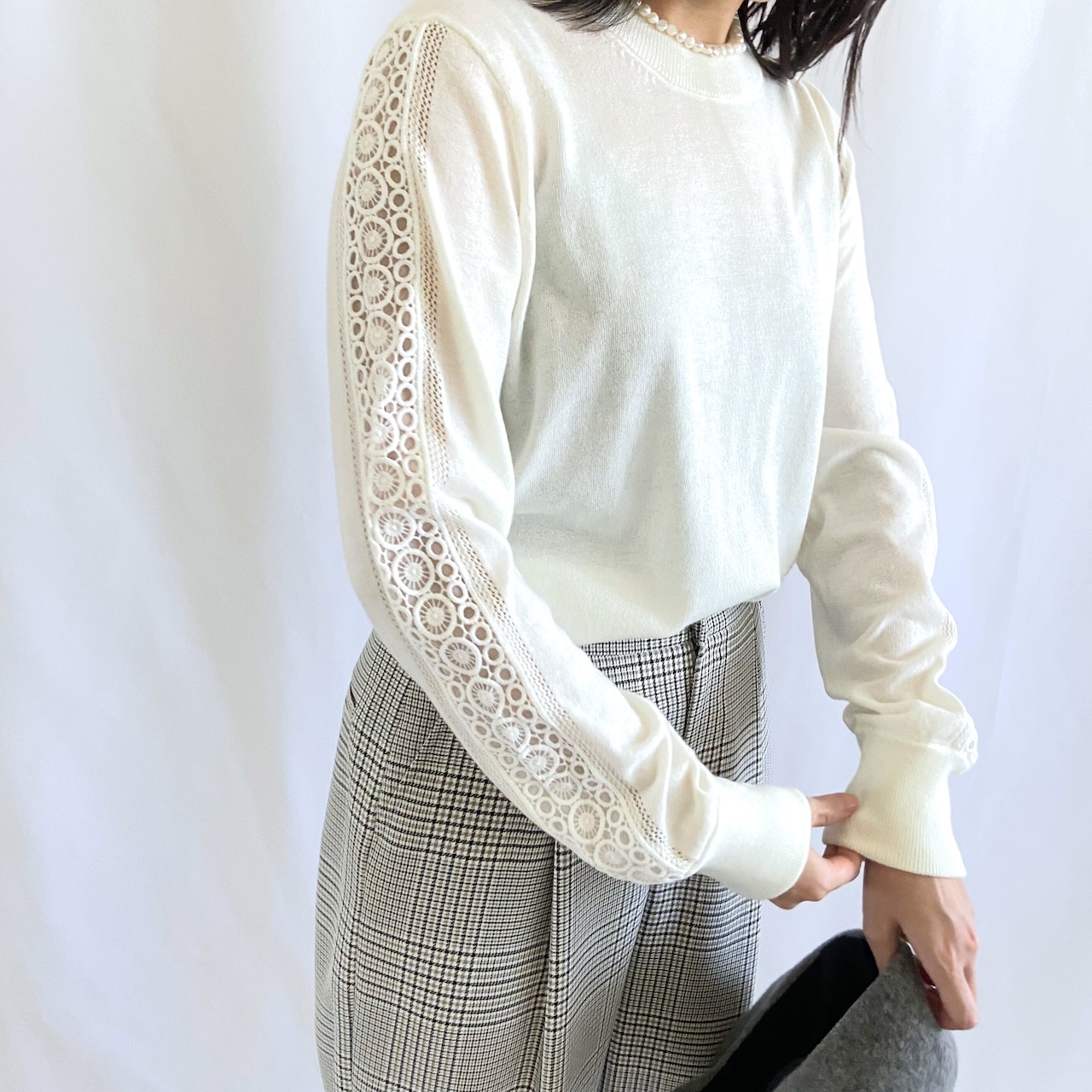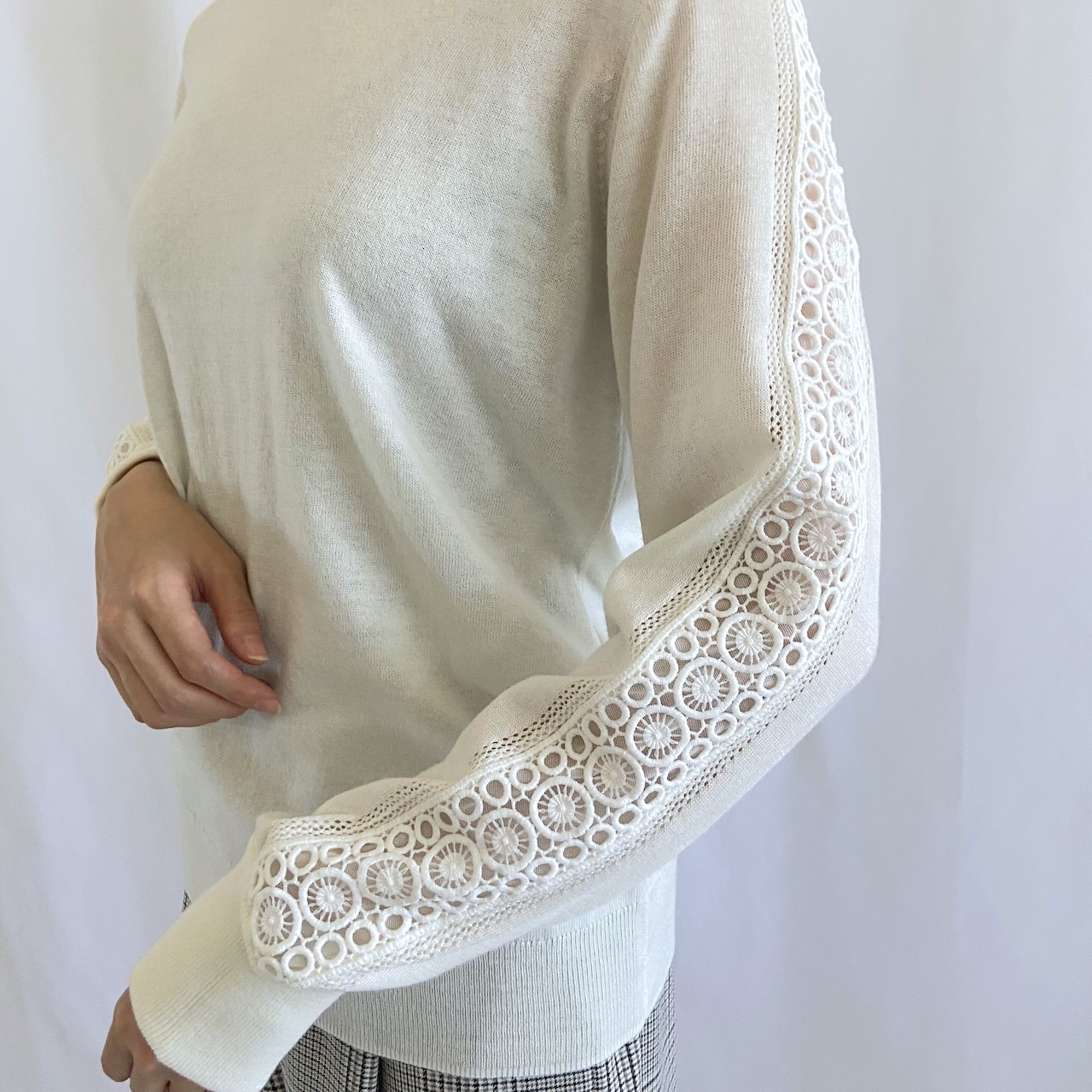 やわらかい肌触りのニットカットソー。袖にあしらったレースがポイントになっています。Vネックタイプ・ハイネックタイプの形違いもあります。