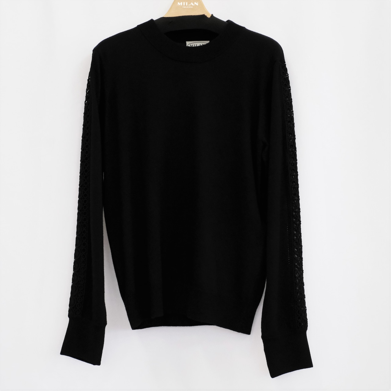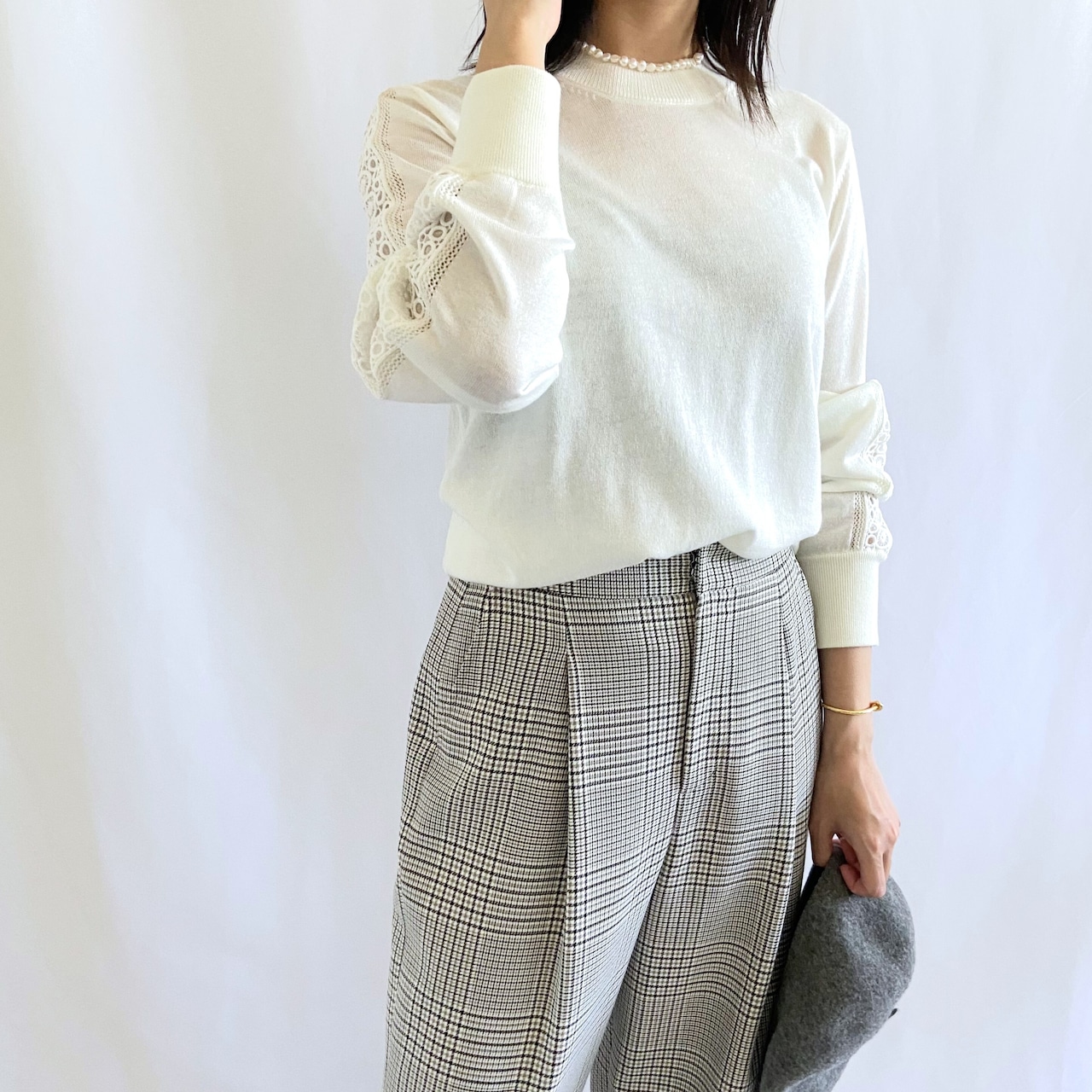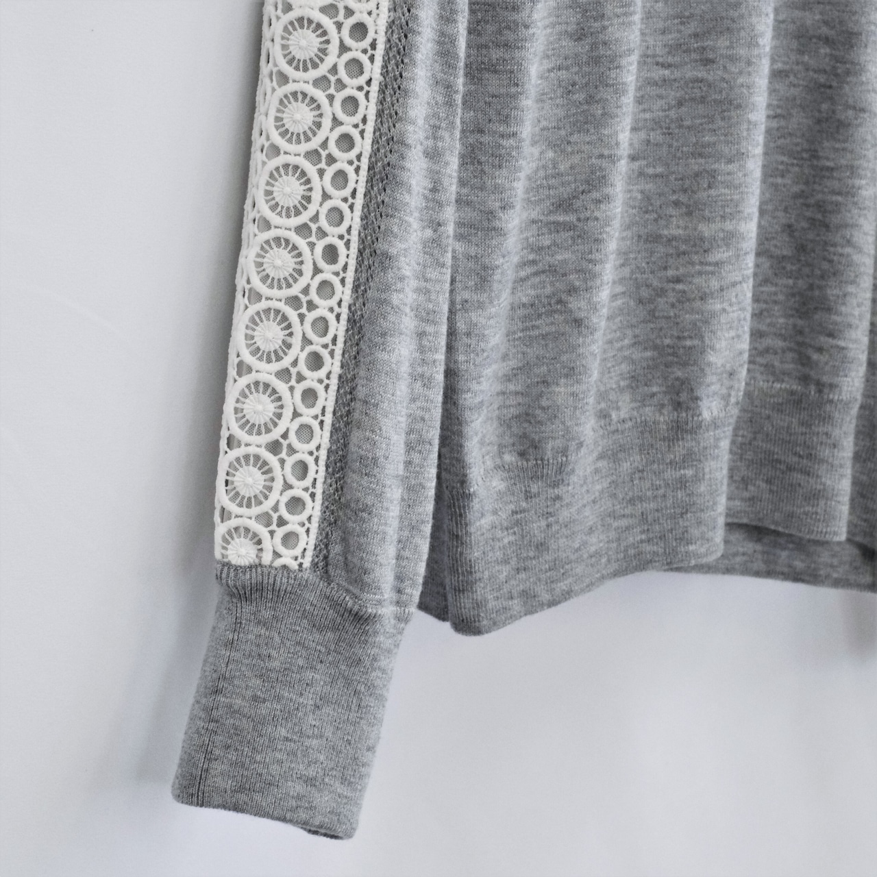 やわらかい肌触りのニットカットソー。袖にあしらったレースがポイントになっています。Vネックタイプ・ハイネックタイプの形違いもあります。