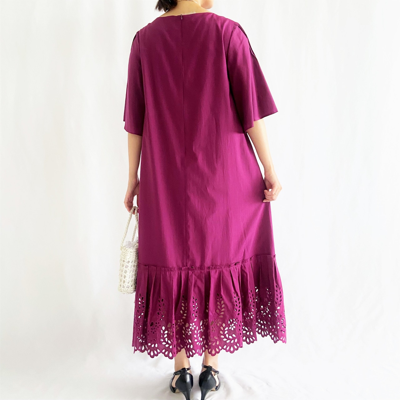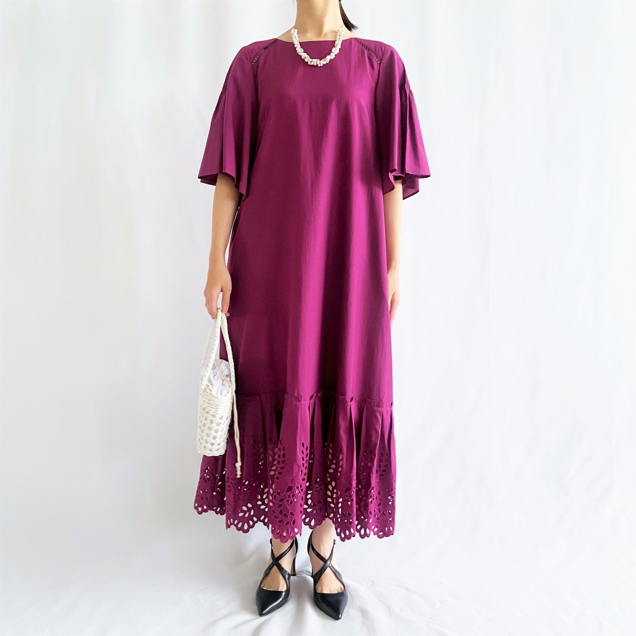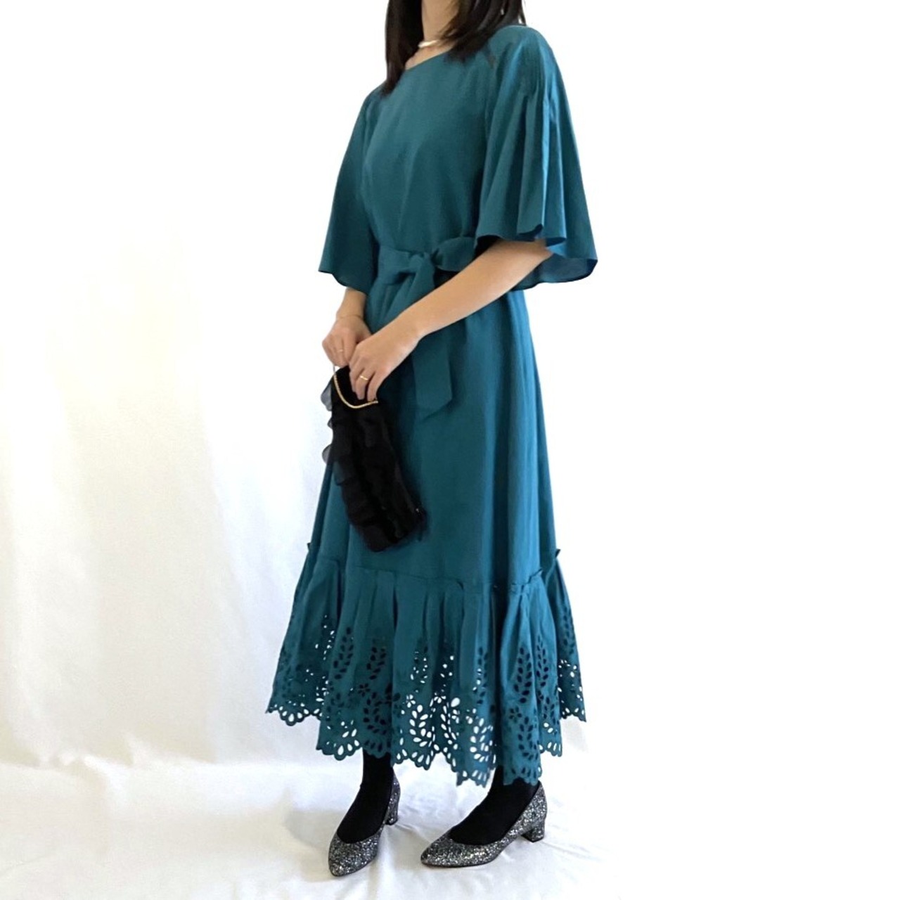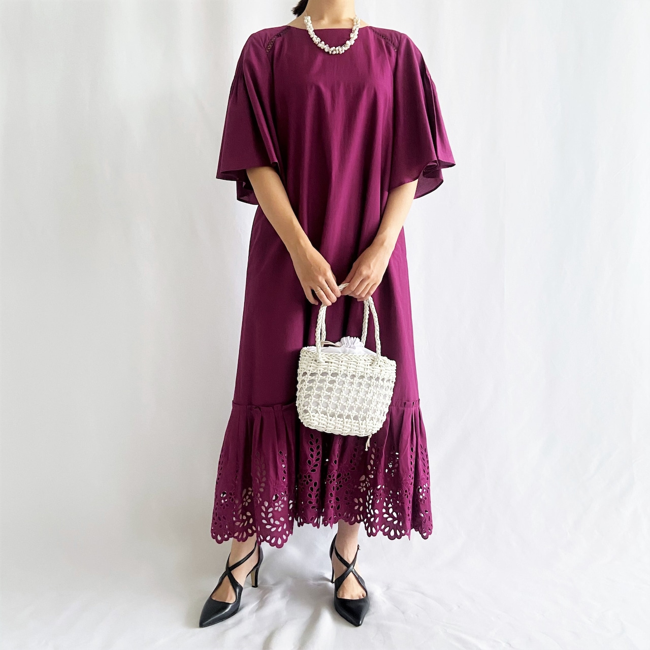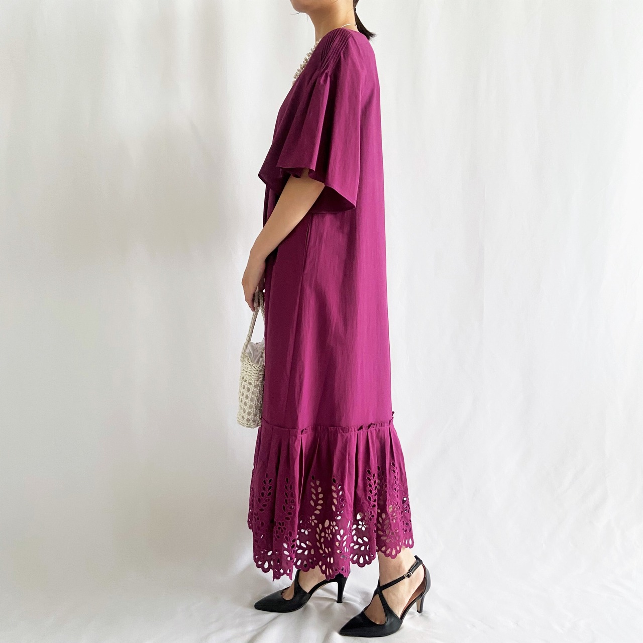 裾にほどこした穴あき刺繍で軽やかな足元に。