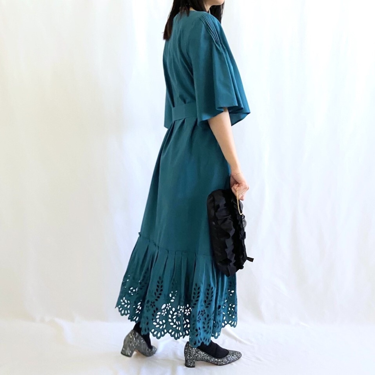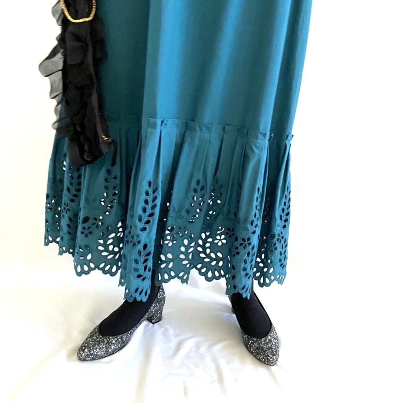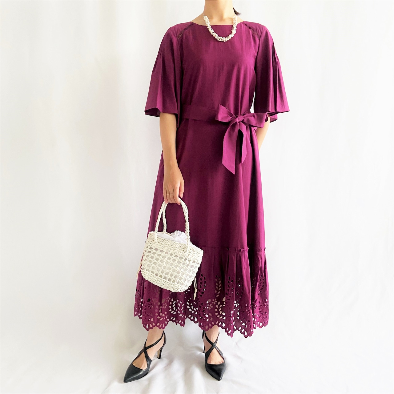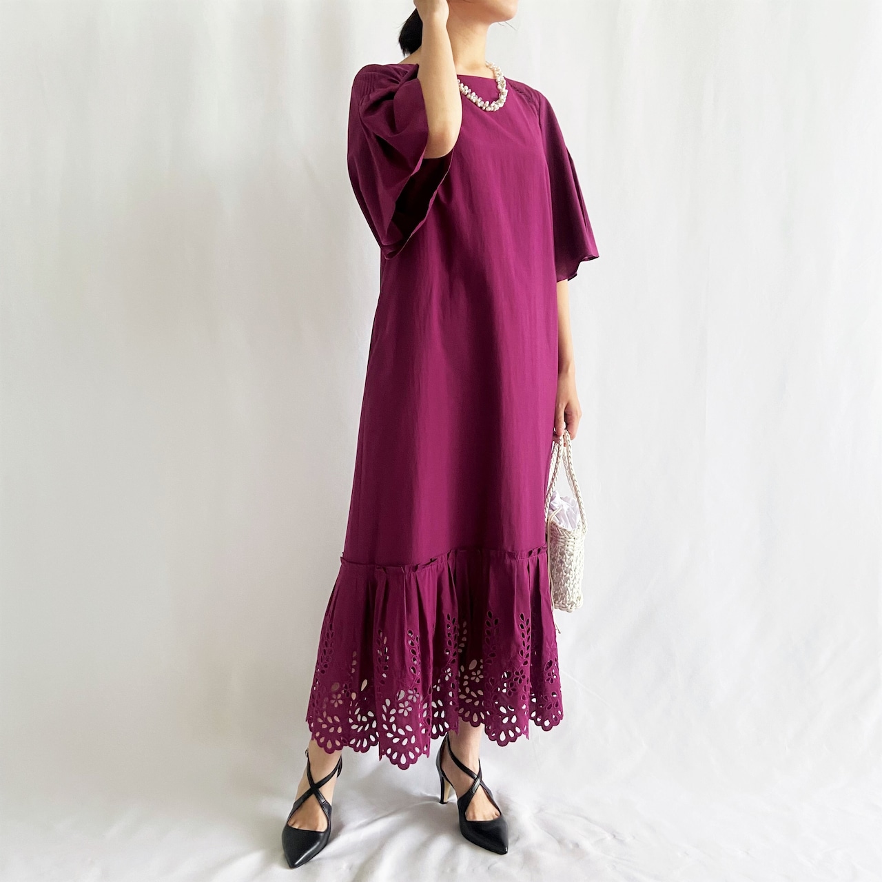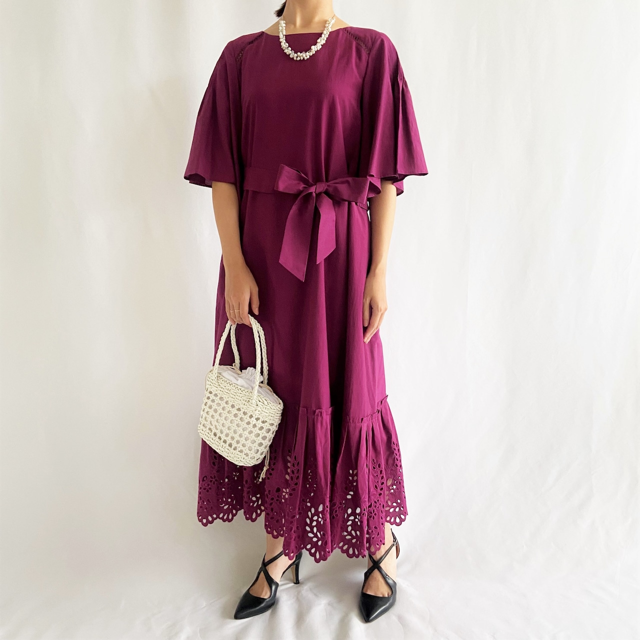 裾にほどこした穴あき刺繍で軽やかな足元に。