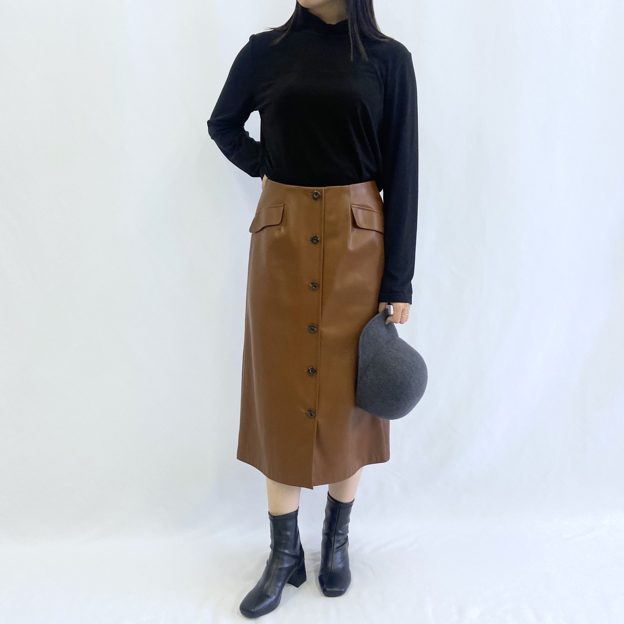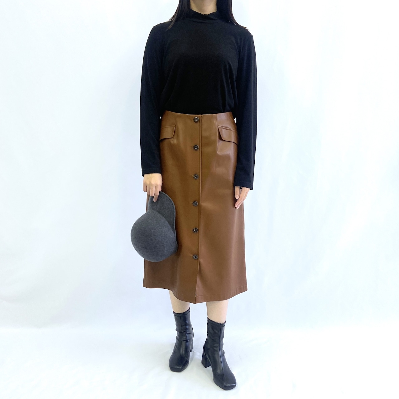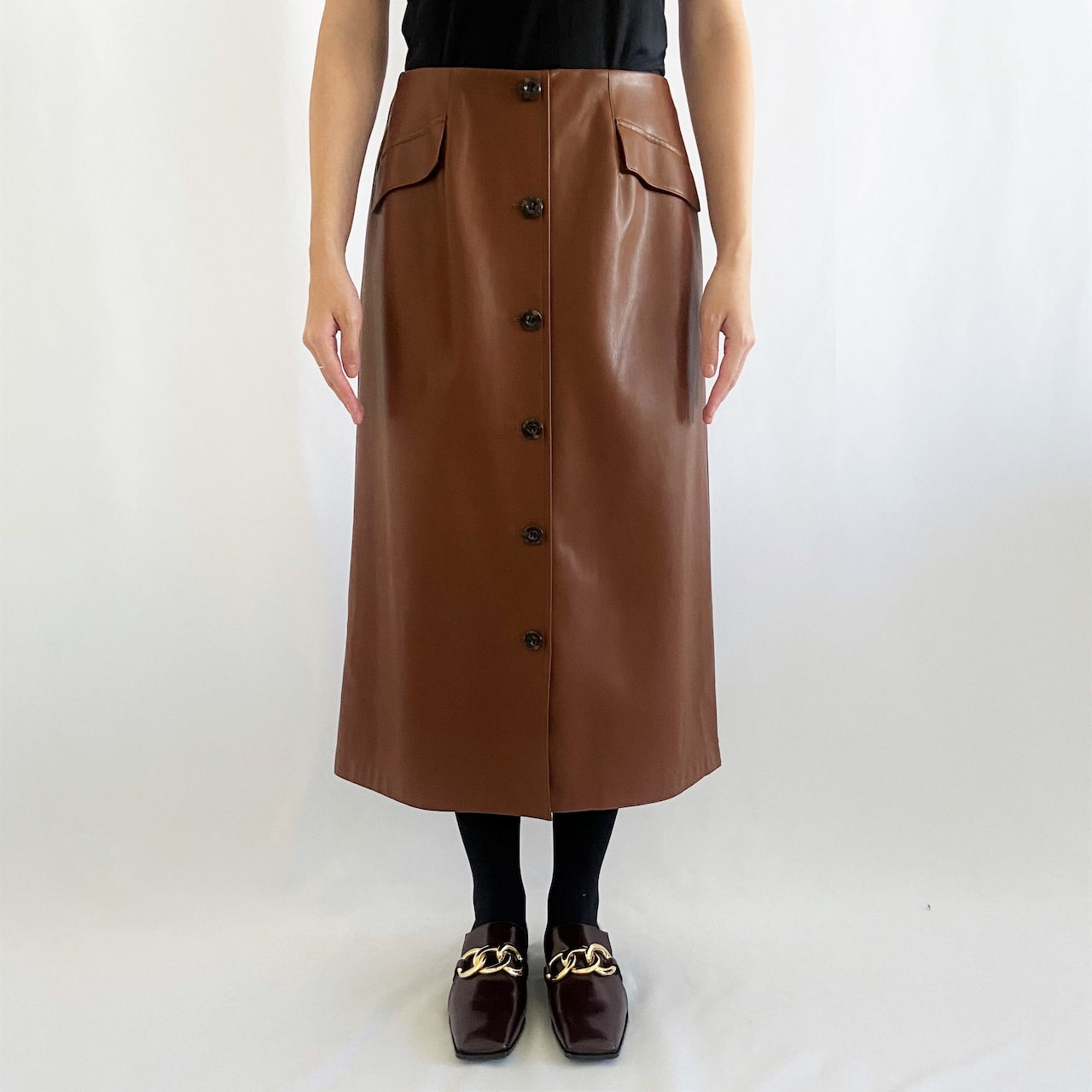 フロントのボタンがポイントになったレザーのタイトスカート。