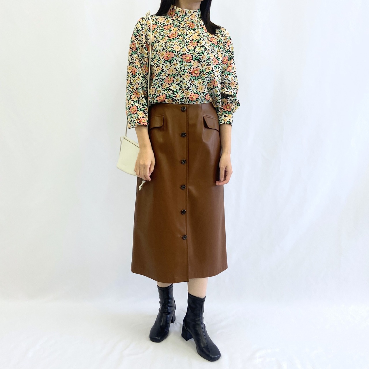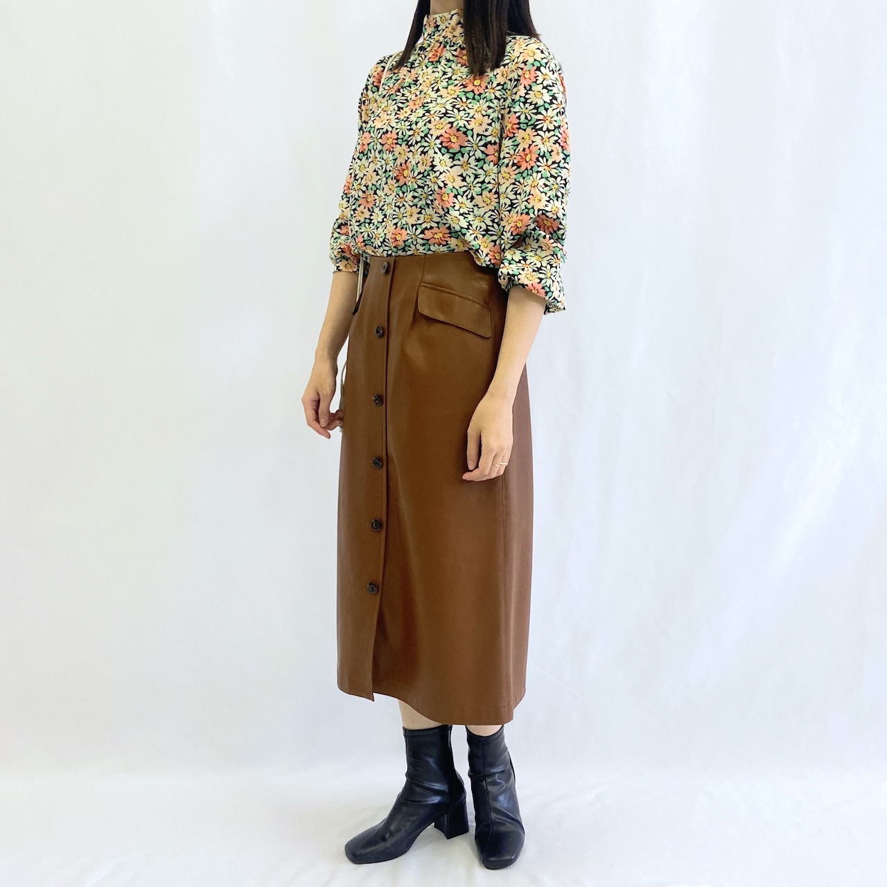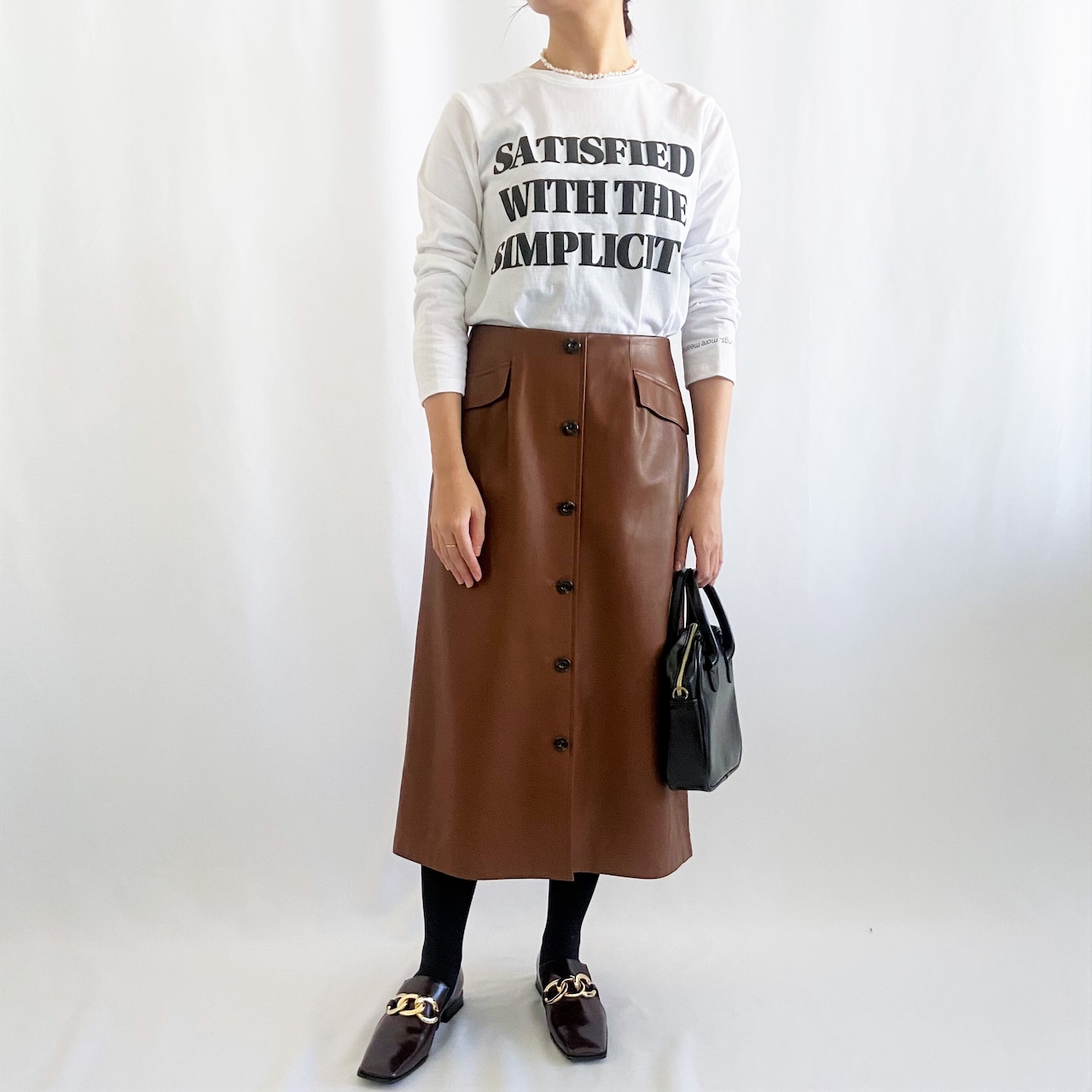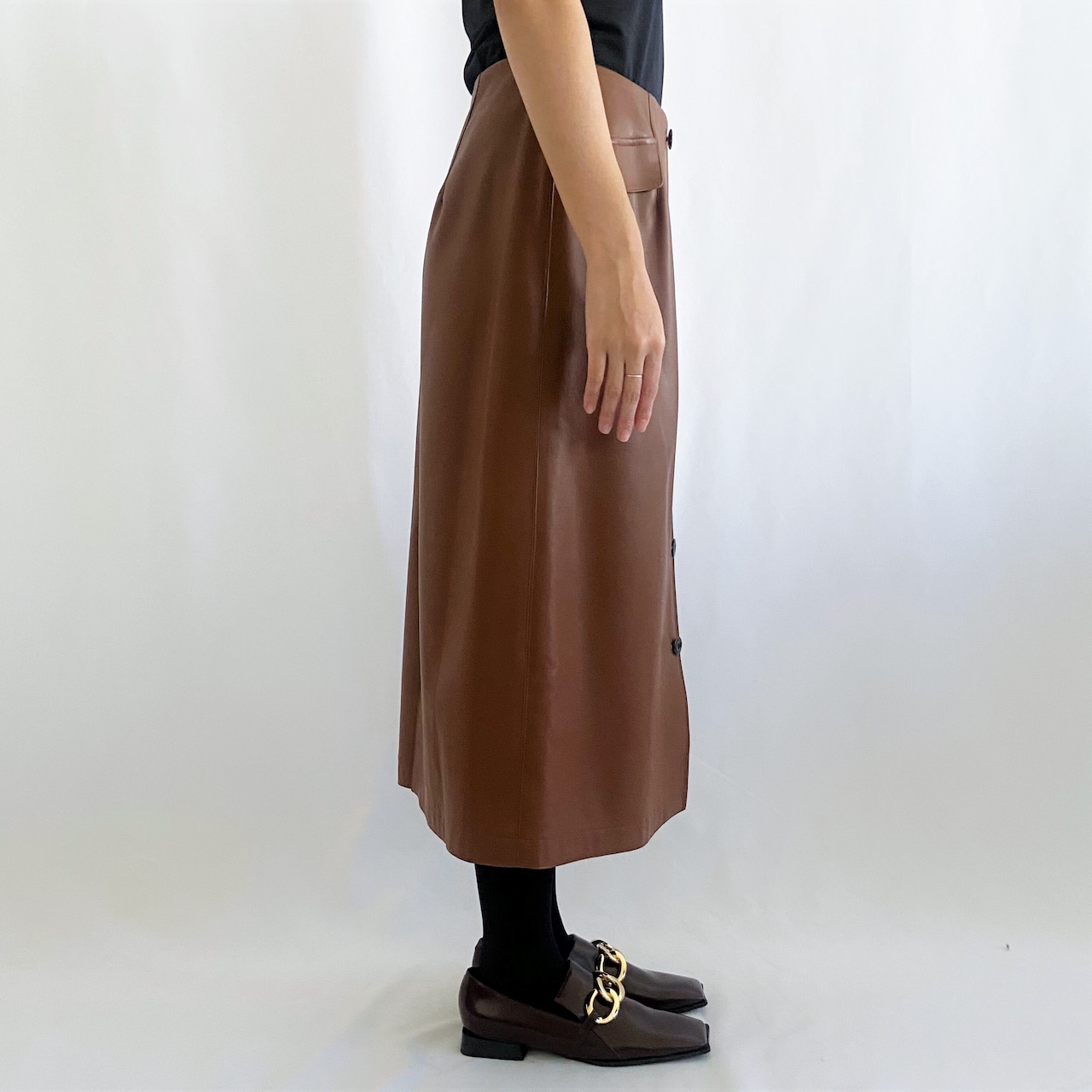フロントのボタンがポイントになったレザーのタイトスカート。