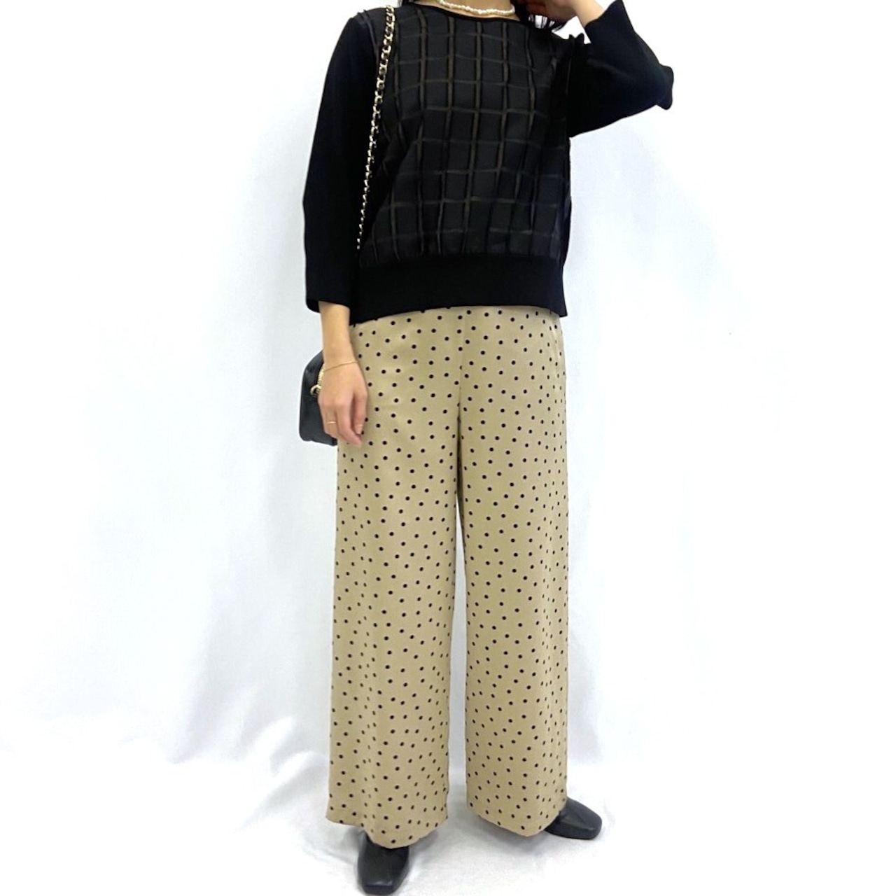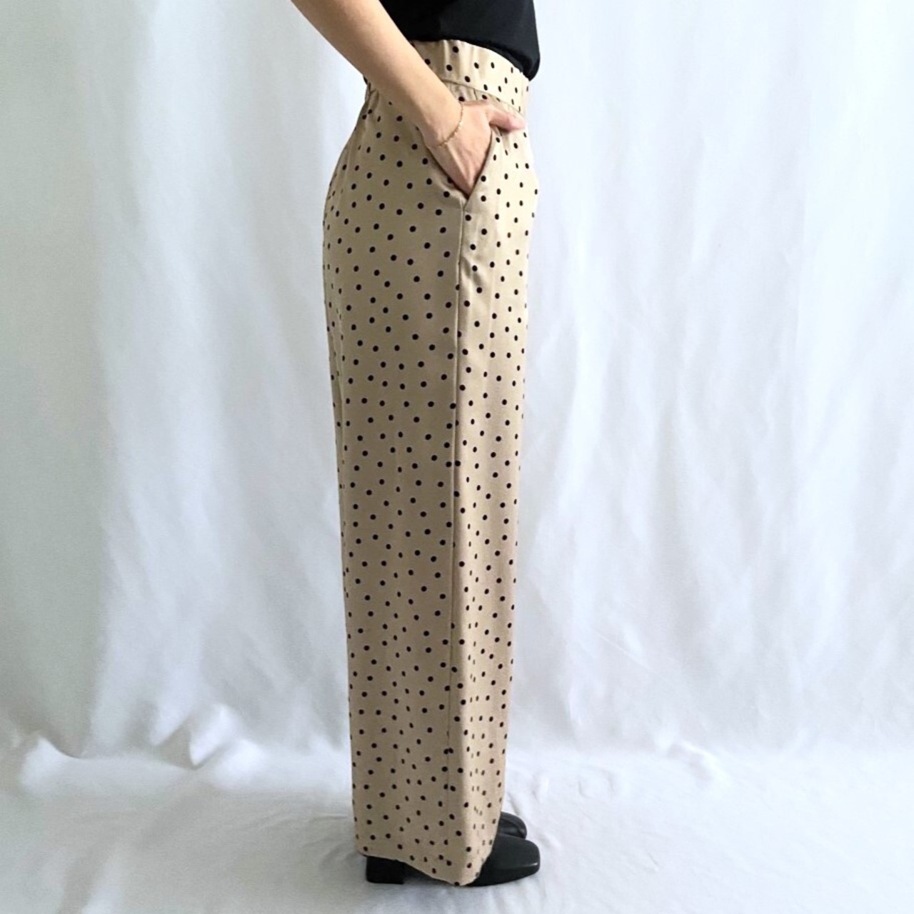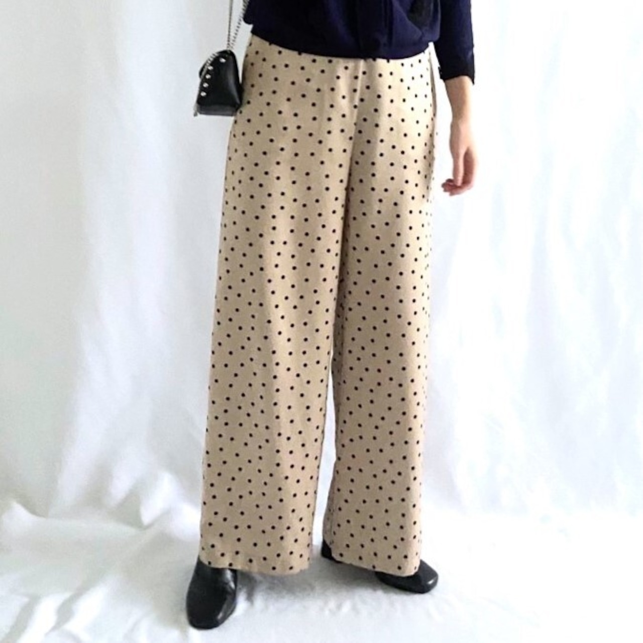 サテン生地にドット柄がレディライクながら綺麗目に使えるワイドパンツ。