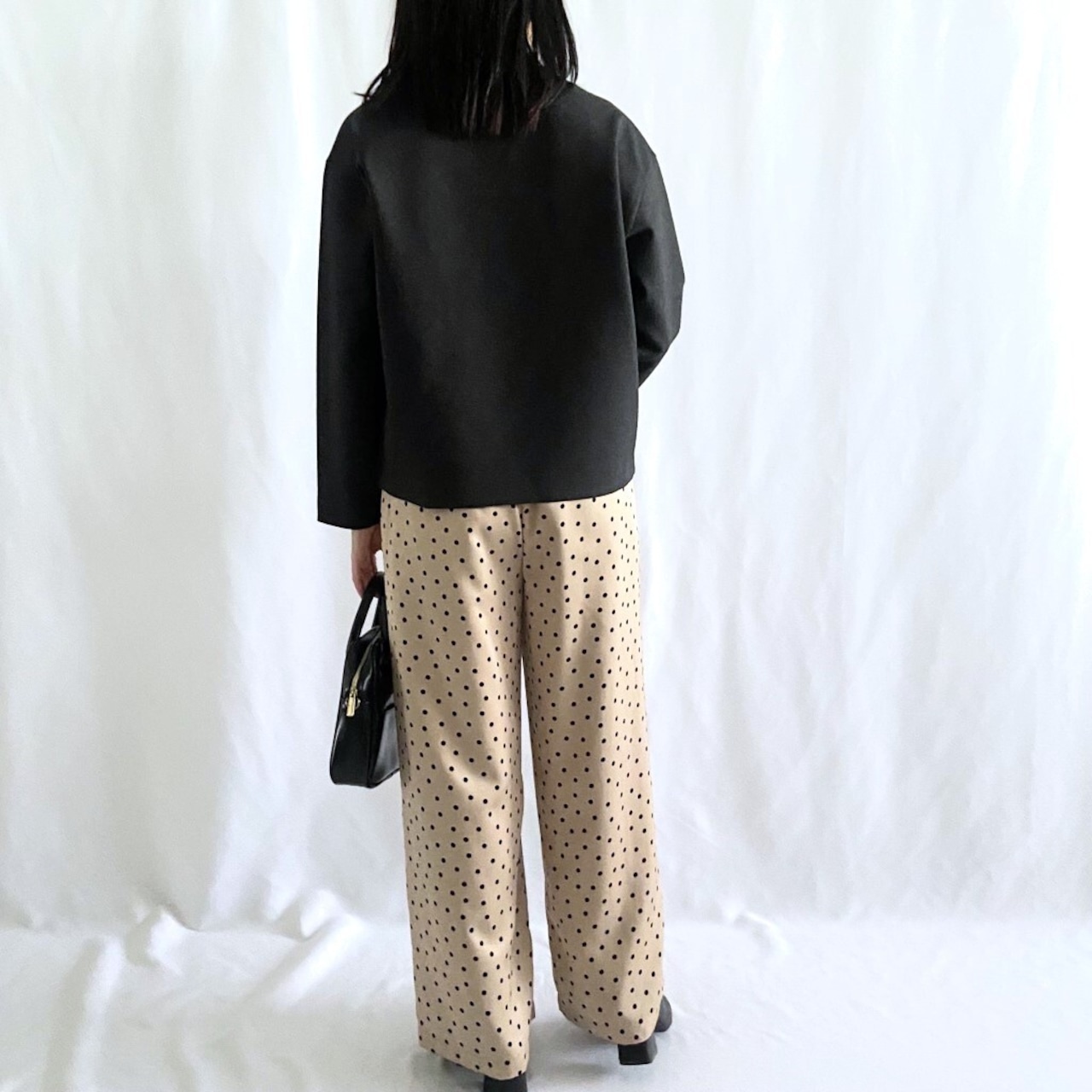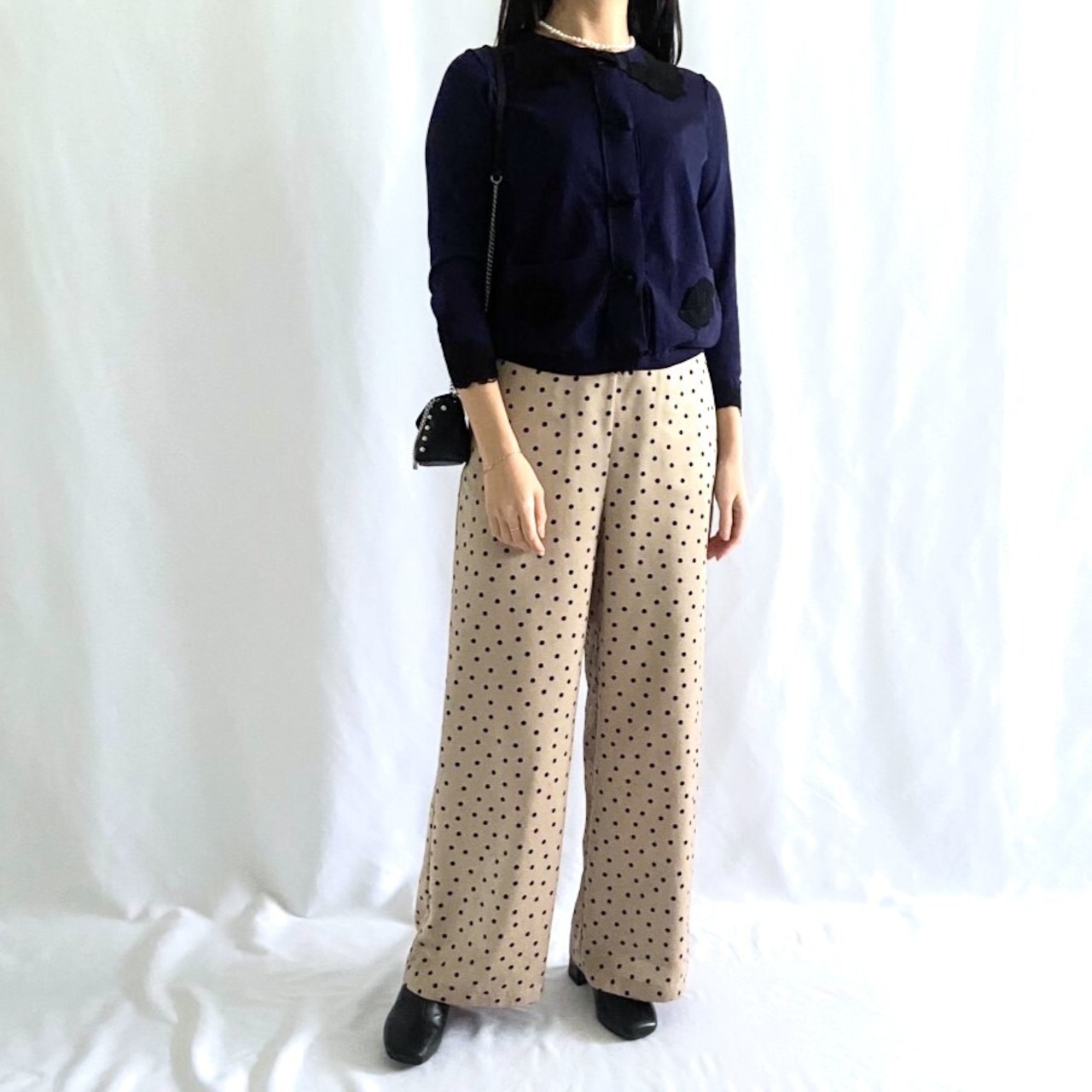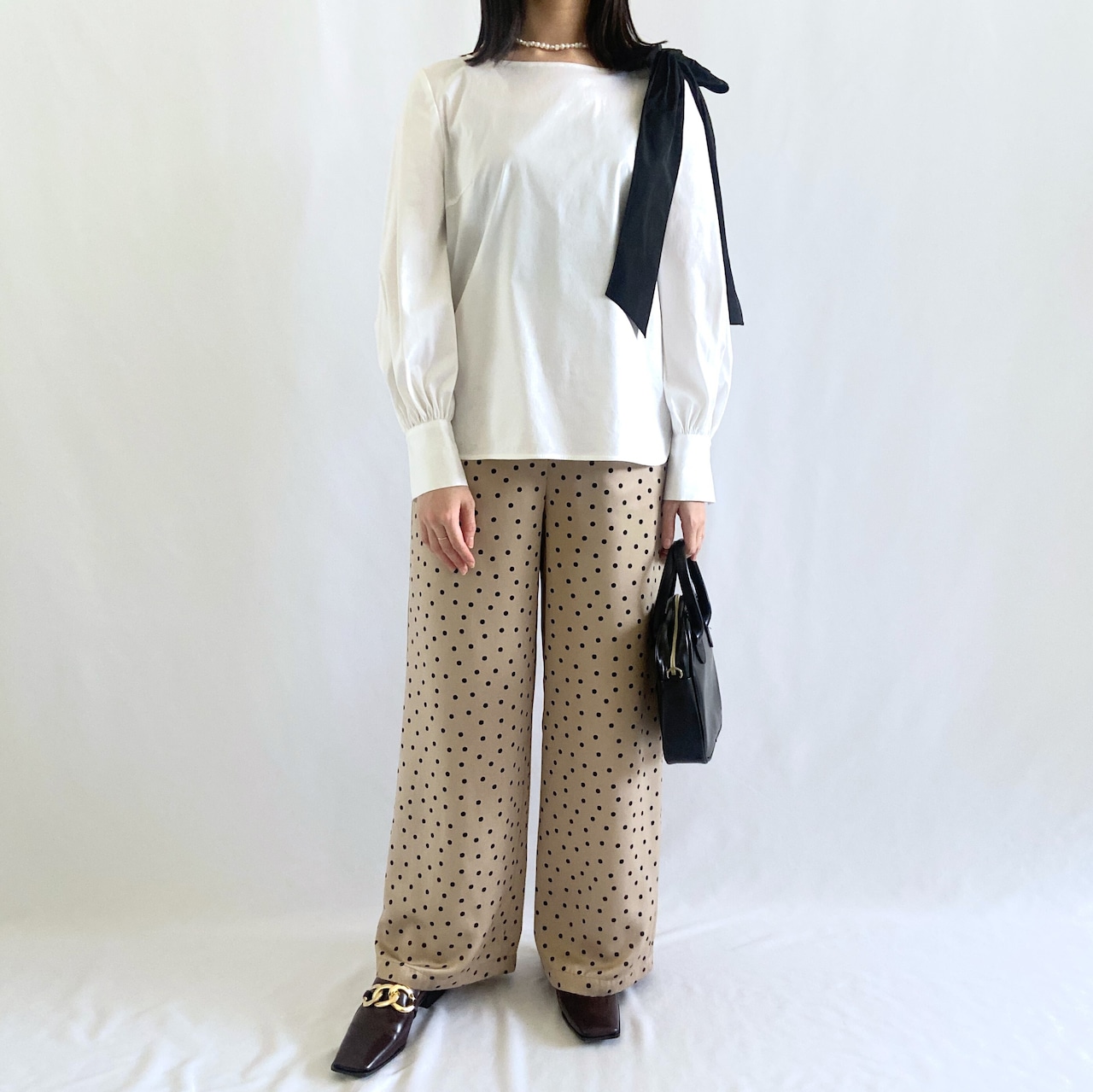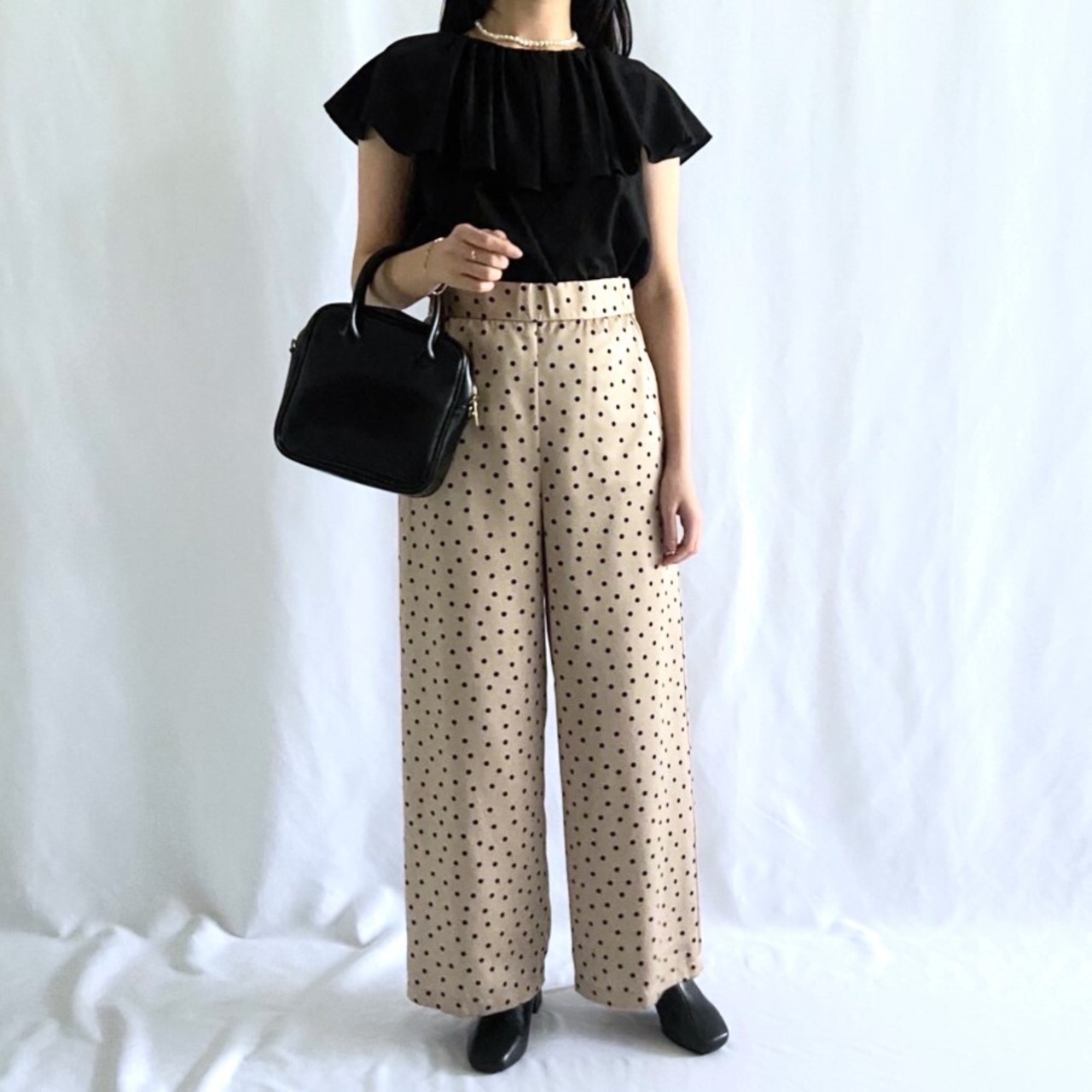 サテン生地にドット柄がレディライクながら綺麗目に使えるワイドパンツ。