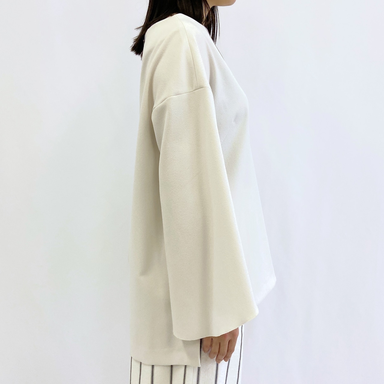 ゆったりとしたシルエットと前後差のあるシルエットがこなれ感のある1枚。
