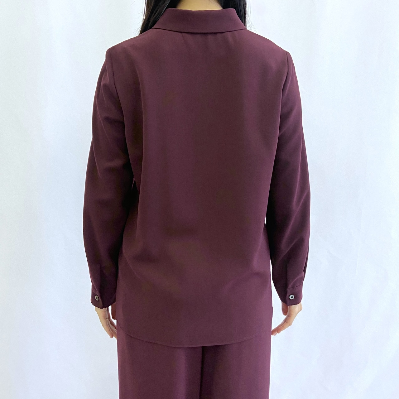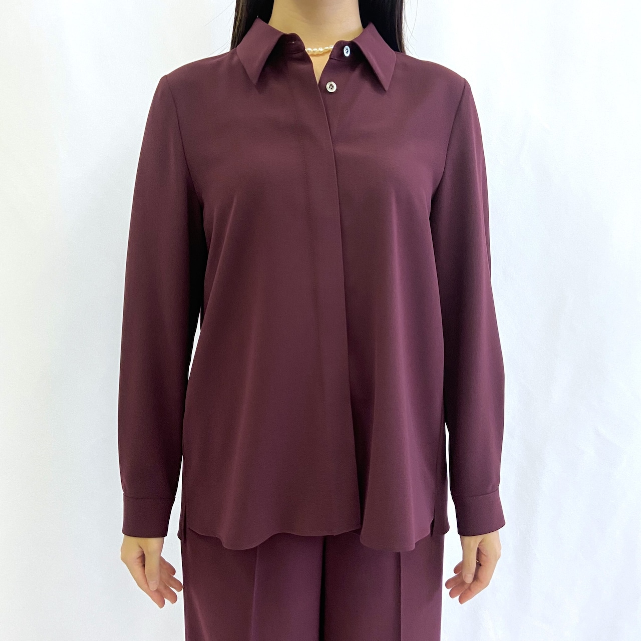 ポリエステルのからりとした生地でしわになりにくいシャツブラウス。