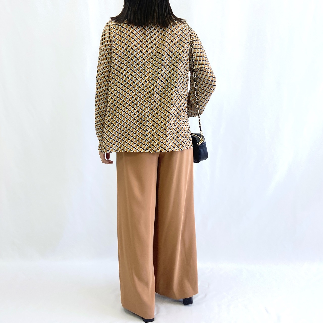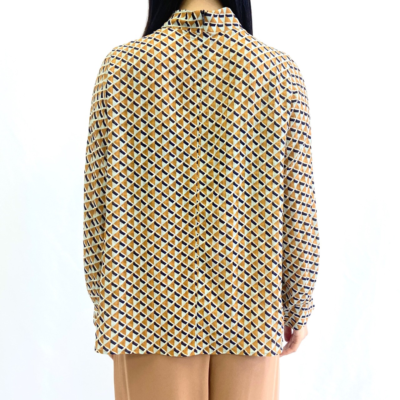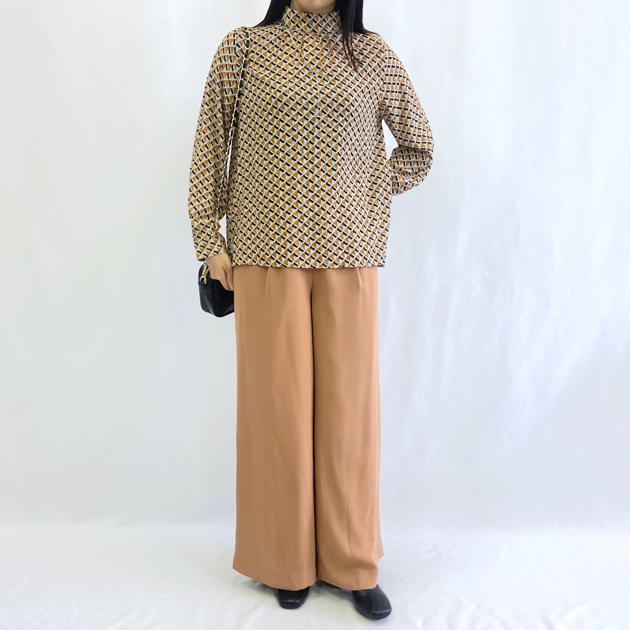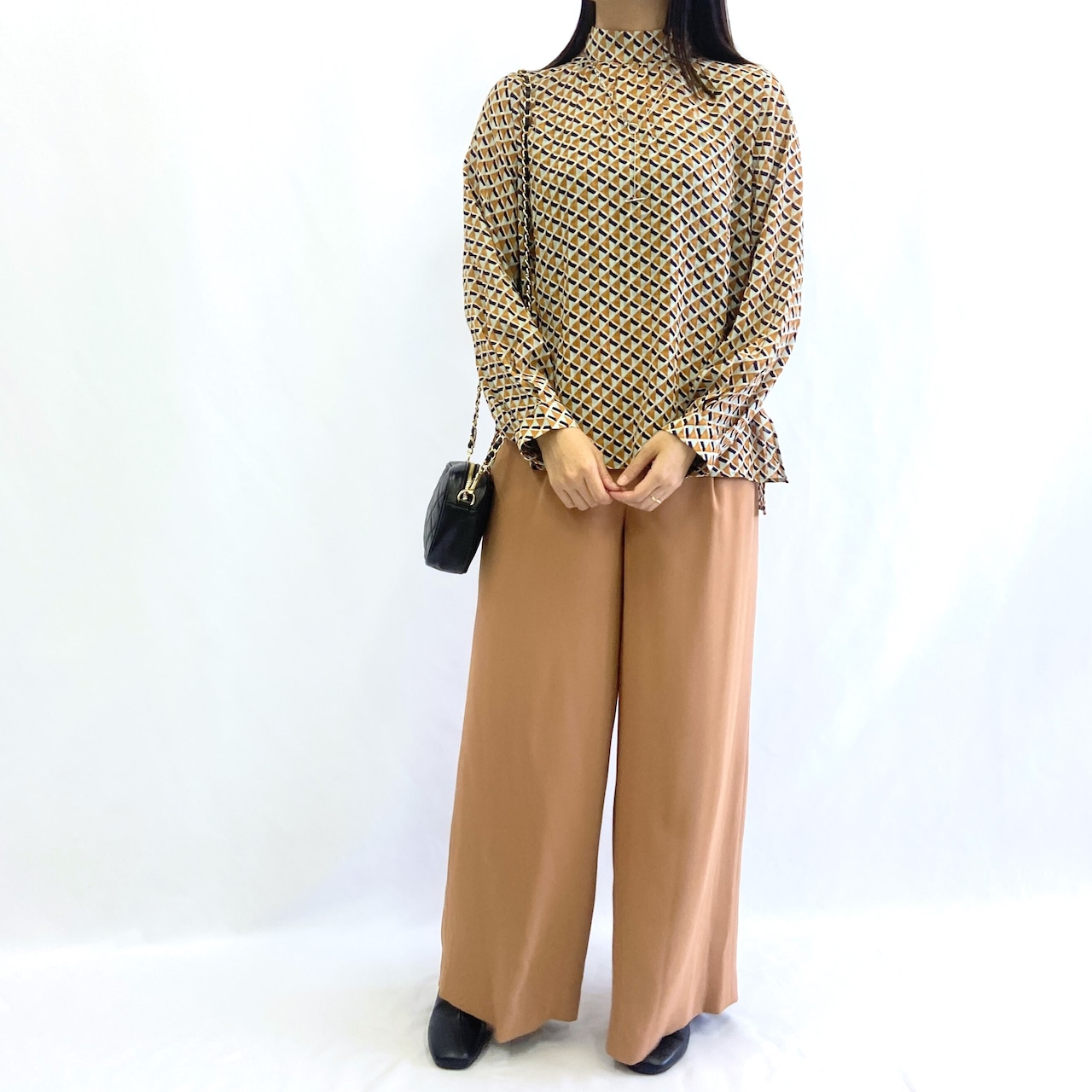 柔らかい配色が合わせやすいナチュラルな幾何学柄がポイントのハイネックブラウス。
