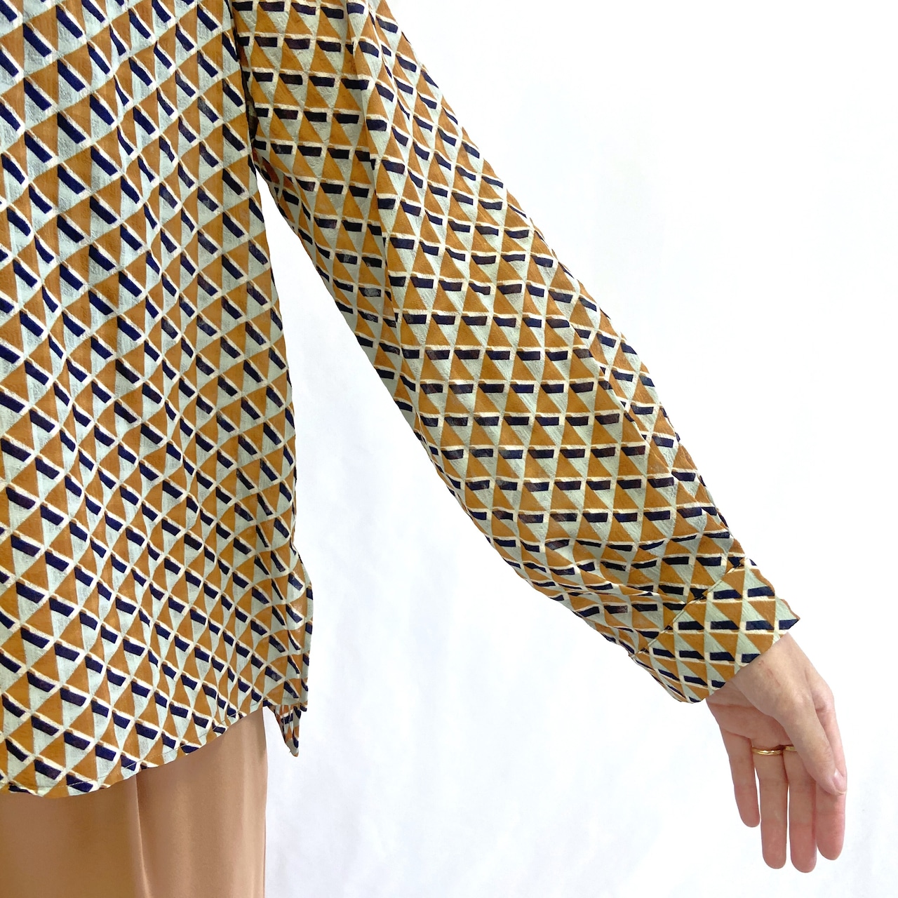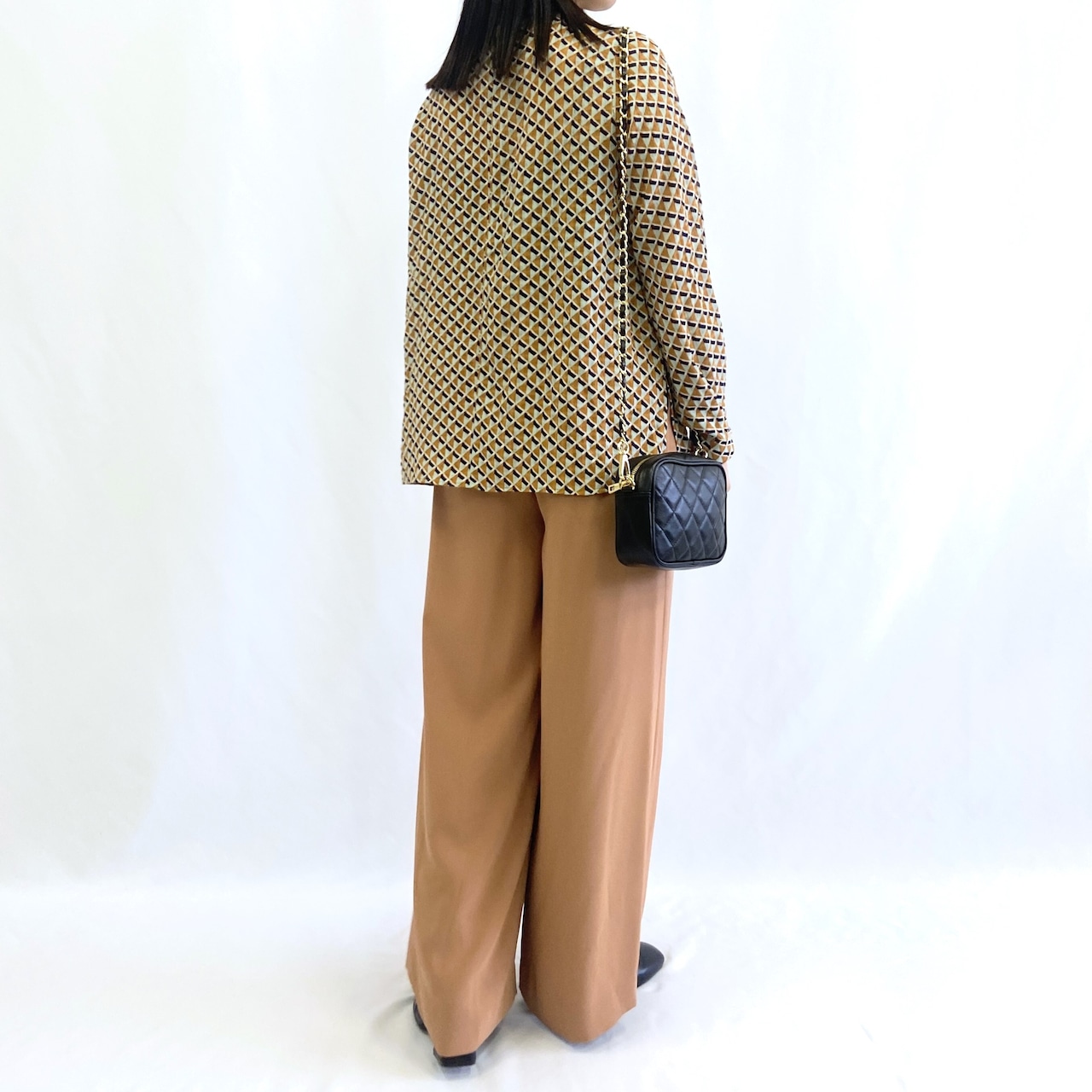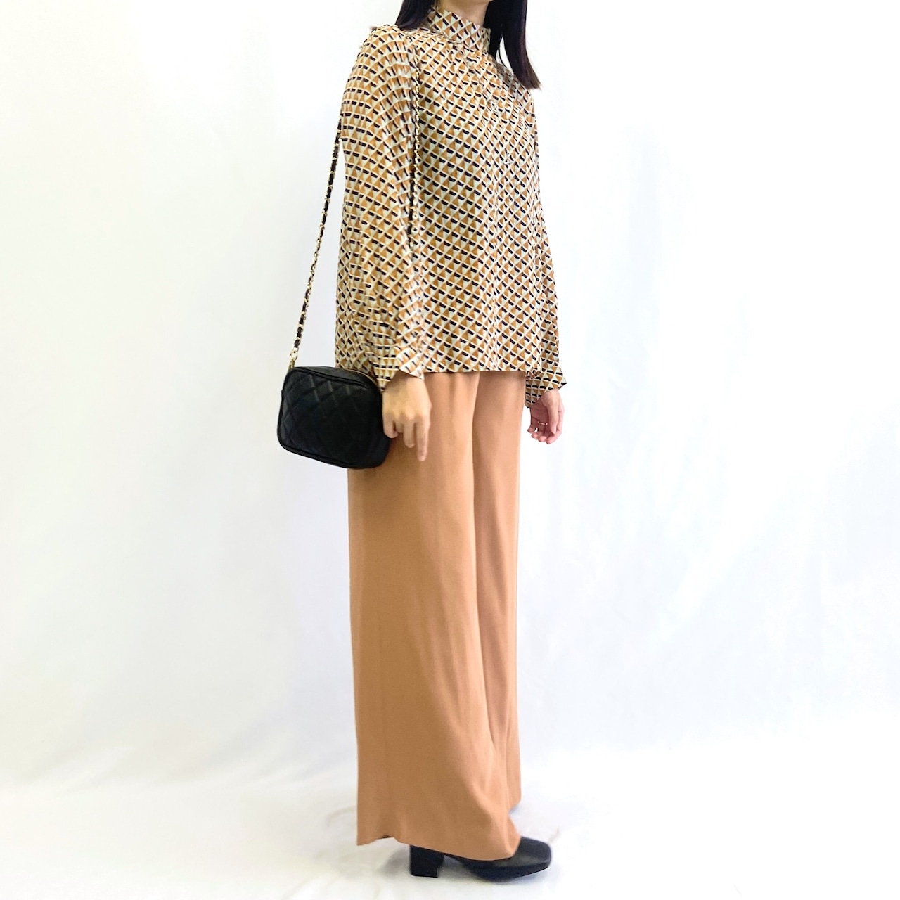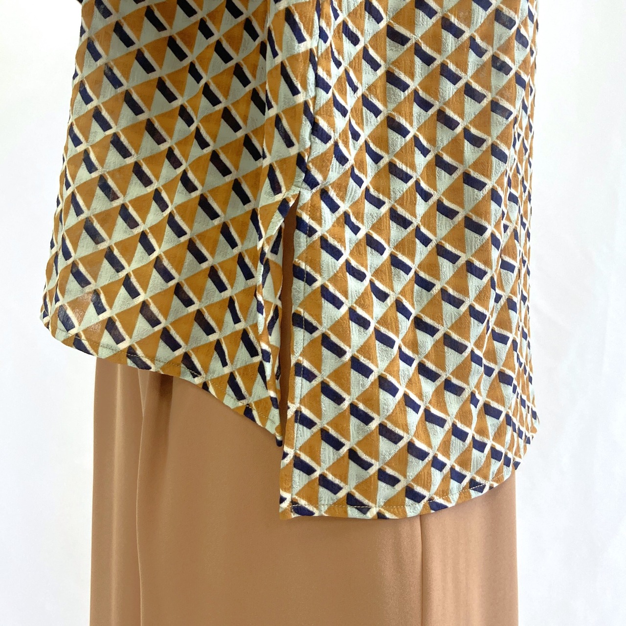 柔らかい配色が合わせやすいナチュラルな幾何学柄がポイントのハイネックブラウス。