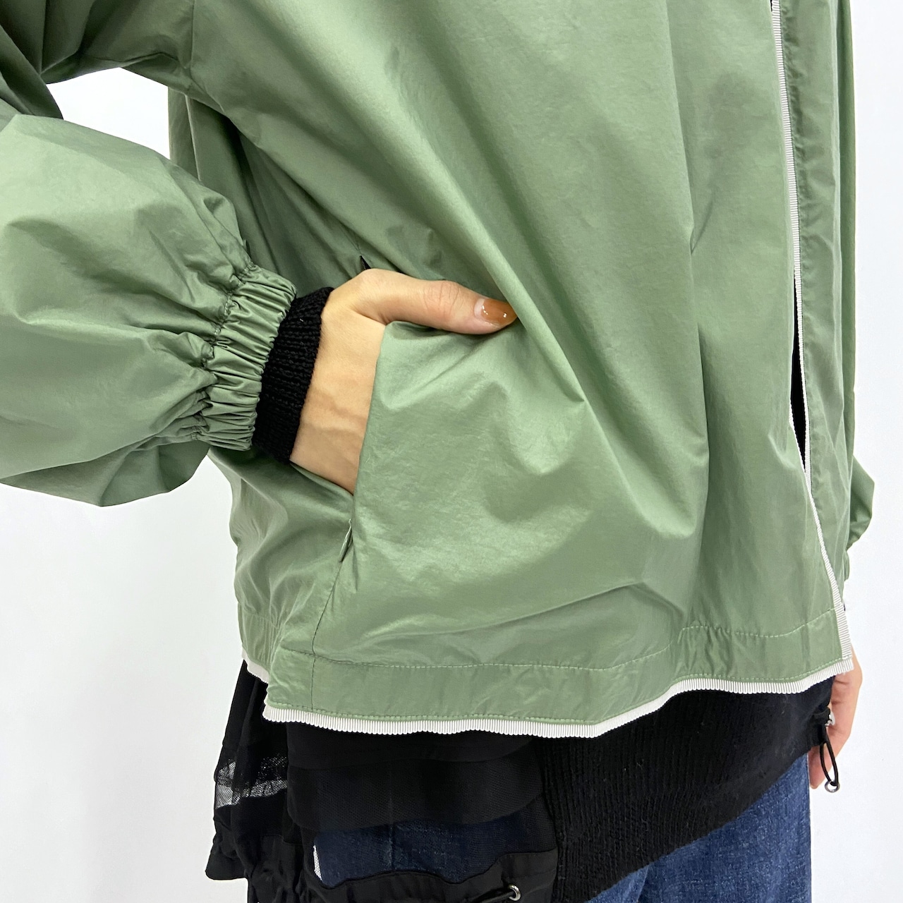 柔らかいグリーンが目を惹くナイロンジャケット。