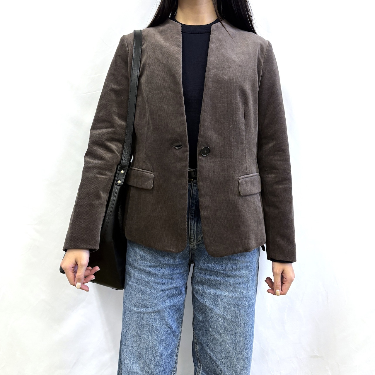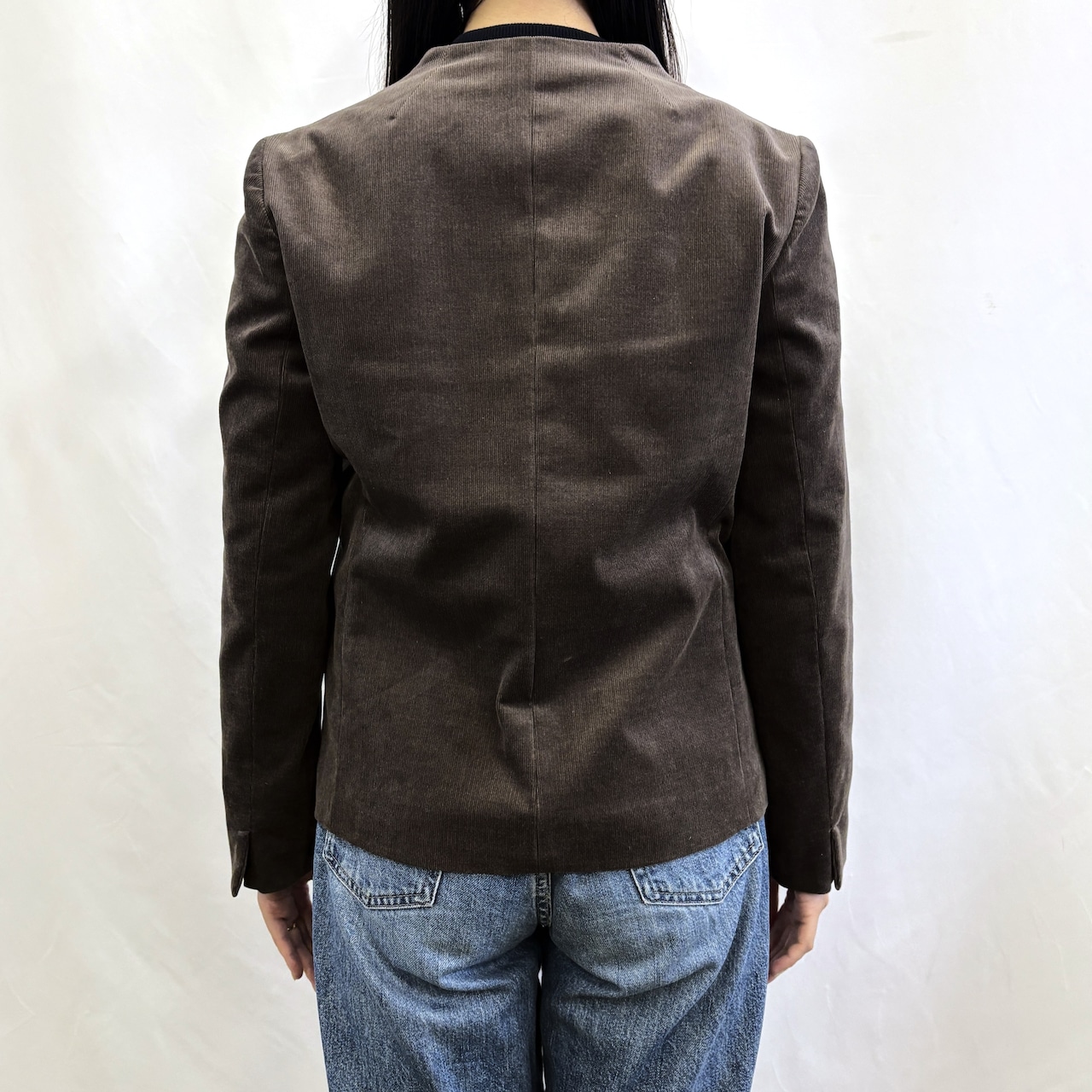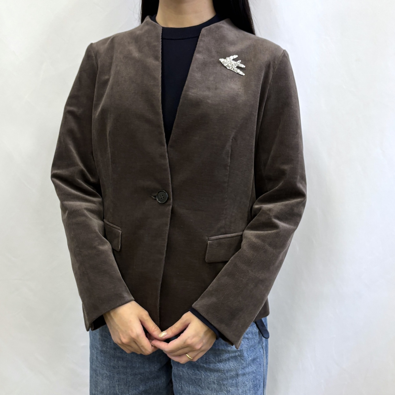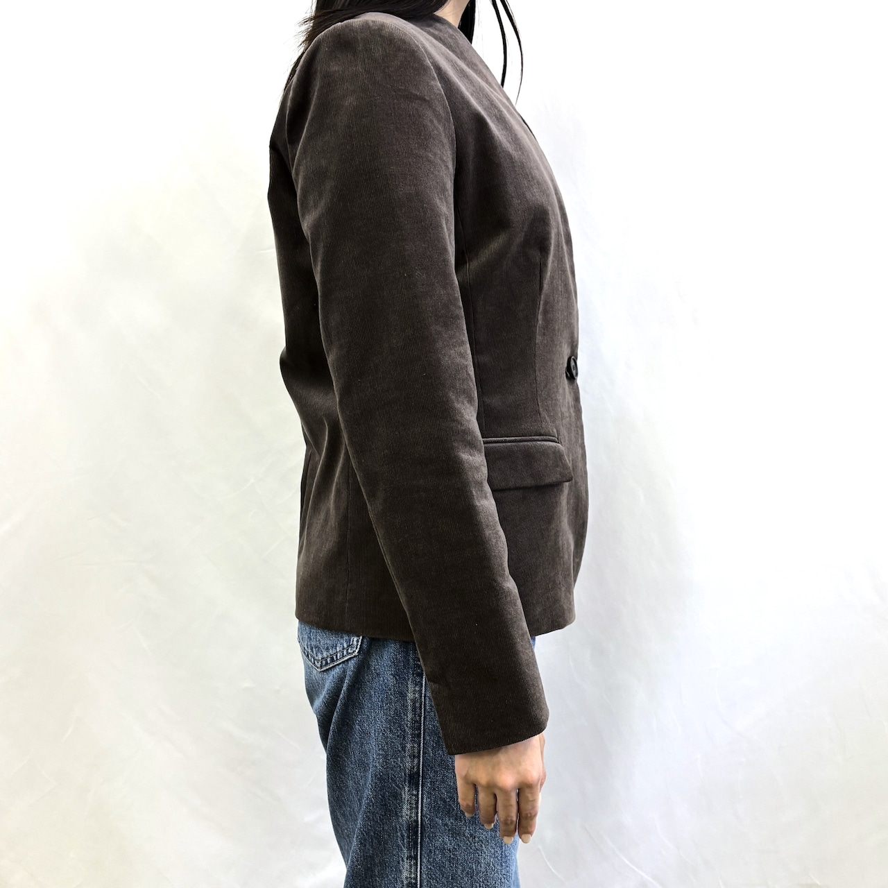 キーネックですっきり見えするコーデュロイジャケット。